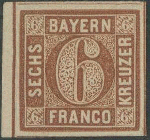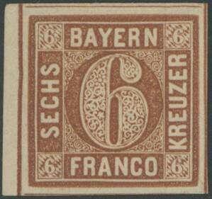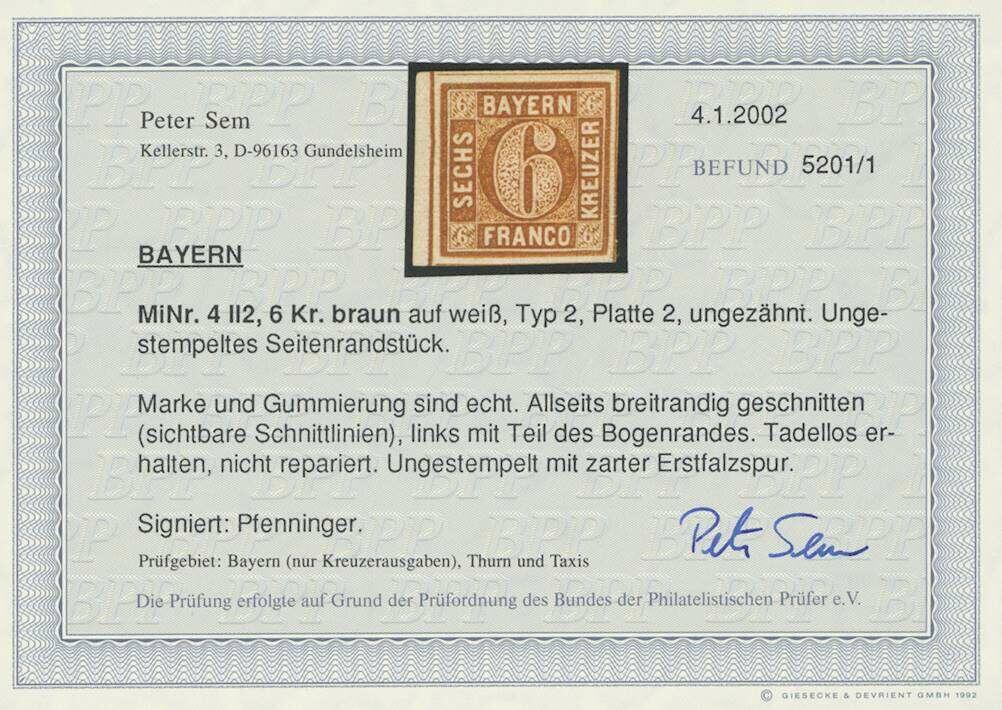 | Zusatzinformationen und Suchstichworte: | Ulrich Felzmann 178. Auktion 22. Juni 2023 Los 2480 Altdeutschland Bayern 6 Kr braun in Type II von Platte 2, ungebraucht mit lediglich zarter Erstfalzspur und links kleinem Bogenrand (!) in ringsum gleichmäßig breitrandiger, farbfrischer Luxus-Erhaltung mit sämtlichen Schnittlinien sichtbar! Sign. Pfenninger sowie Fotobefund Sem BPP Ausruf 120,00 EUR |