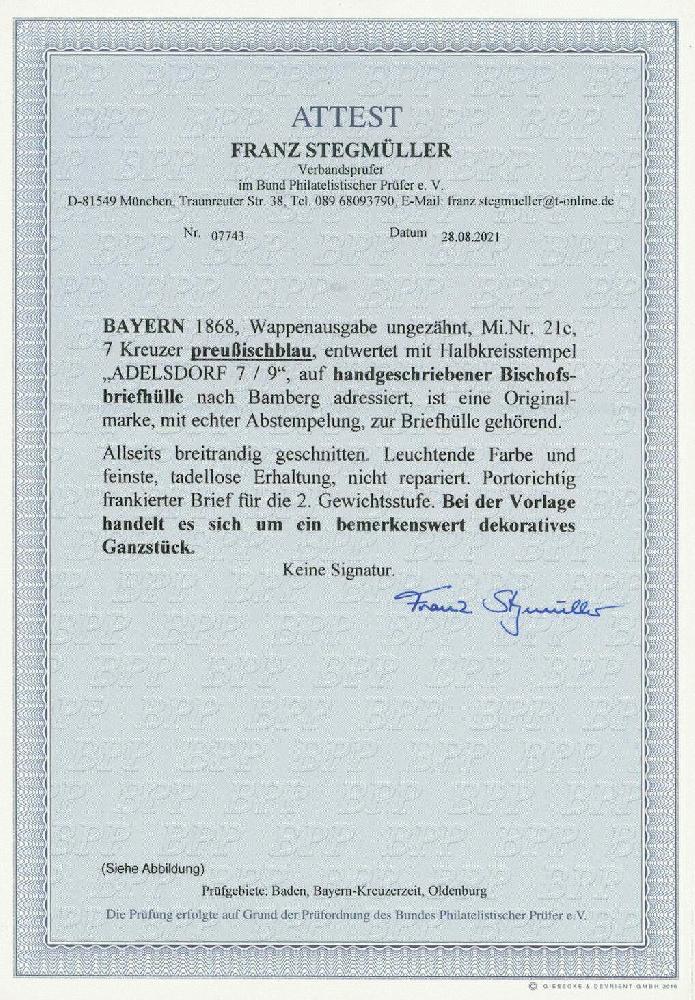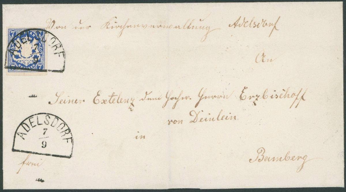 | Zusatzinformationen und Suchstichworte: | Ulrich Felzmann 178. Auktion 22. Juni 2023 Los 2488 Altdeutschland Bayern 7 Kr preußischblau, leuchtend farbfrisch und ringsum breitrandig auf ungemein attraktiver, handgeschriebener Bischofs-Briefhülle ADELSDORF 7/9 nach Bamberg in tadelloser Luxus-Erhaltung, Fotoattest Stegmüller BPP "... ein bemerkenswert dekoratives Ganzstück" - Sicherlich einer der schönsten Belege dieser seltenen Farbe, zudem auf handgeschriebenem Bischofs-Brief mit seltenerem AdressatenMichael Deinlein, ab 1856 Ritter von Deinlein (1800-1875) war von 1858 bis 1875 Erzbischof von Bamberg Ausruf 2.000,00 EUR |