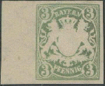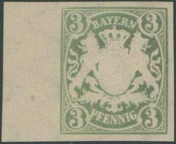 | Zusatzinformationen und Suchstichworte: | Ulrich Felzmann 178. Auktion 22. Juni 2023 Los 2499 Altdeutschland Bayern 3 Pfg Wappenausgabe ungezähnt, ungebrauchtes linkes Randstück in breitrandiger und farbfrischer Prachterhaltung, Fotoattest Dr. Helbig BPP "Die Qualität der seltenen Marke ist fehlerlos", € 500,- Ausruf 200,00 EUR |