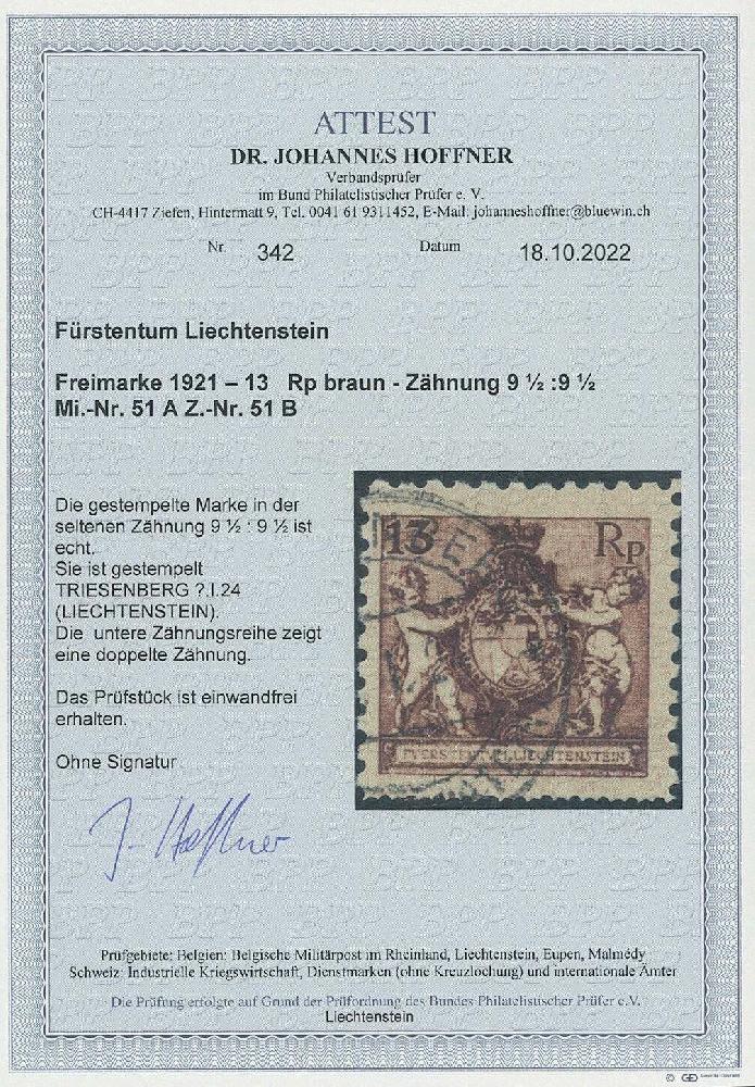 | Zusatzinformationen und Suchstichworte: | Ulrich Felzmann 178. Auktion 22. Juni 2023 Los 2359 Liechtenstein 13 Rp Landeswappen mit weiter Zähnung 9½, zeitgerecht gestempelt in tadelloser, vollzähniger Ausnahmequalität mit unten markant ausgeprägter doppelter Zähnung, zweifach attestiert Reinhardt sowie Hoffner BPP "... einwandfrei erhalten" (Zst. 51B), € 3.000,- Ausruf 750,00 EUR |