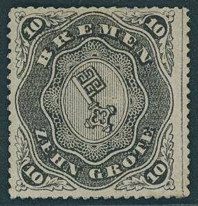 | Zusatzinformationen und Suchstichworte: | Ulrich Felzmann 178. Auktion 22. Juni 2023 Los 2524 Altdeutschland Bremen 10 Gr schwarz, sehr schön sauber ungebraucht mit vollem Originalgummi, herrlich farbfrisch mit gut gelungener, lediglich oben leicht stumpfer Trennung des regelmäßigen Durchstichs, sign. Thier und Dr. Fischer BPP sowie Fotoattest Heitmann BPP "Eine seltene Marke", € 1.000,- Ausruf 300,00 EUR |
