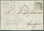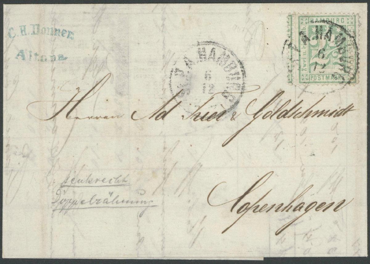 | Zusatzinformationen und Suchstichworte: | Ulrich Felzmann 178. Auktion 22. Juni 2023 Los 2531 Altdeutschland Hamburg 2½ S grün, abgenützter Druck, spektakuläres Stück mit beiderseits senkrechter Doppelzähnung (!) und üblichen, vernachlässigbaren Unregelmäßigkeiten in bildschöner EF auf vollständigem Auslands-Faltbrief ST.P.A. HAMBURG 6 12 (1865) nach Copenhagen mit rs. Ank.-Stempel, Fotoattest Lange BPP "Doppelzähnungen von Hamburg sind bei fast allen gezähnten Marken bekannt. Auf Brief jedoch von sehr großer Seltenheit" Ausruf 1.500,00 EUR |