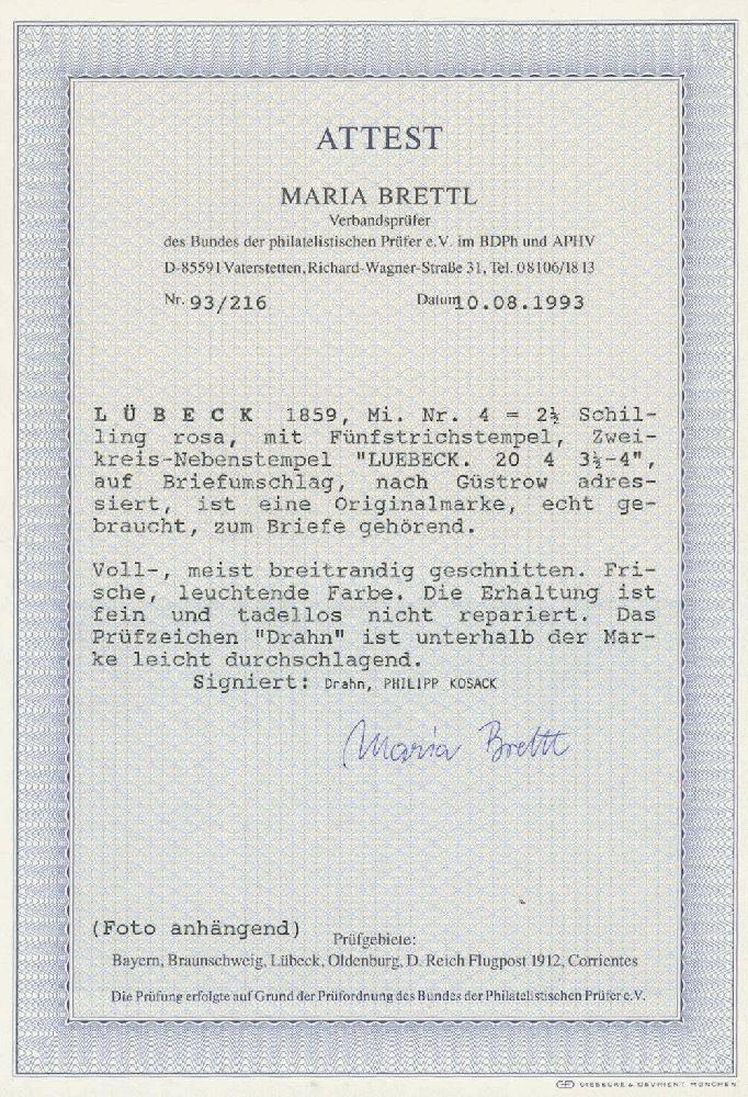 | Zusatzinformationen und Suchstichworte: | Ulrich Felzmann 178. Auktion 22. Juni 2023 Los 2562 Altdeutschland Lübeck 2½ S magenta, ringsum voll-, meist breitrandiges und herrlich farbfrisches Kabinettstück mit ideal klar aufsitzendem Funfstrichstempel auf besonders wirkungsvollem, rs. gesiegeltem blauem Ausnahme-Kuvert LUEBECK 20/4 nach Güstrow, rs. Bahnpost HAGENOW-ROSTOCK sowie Ausg.-Stempel 24.4., sign. Drahn und Pfeninger sowie Fotoattest Brettl BPP Ausruf 3.500,00 EUR |
