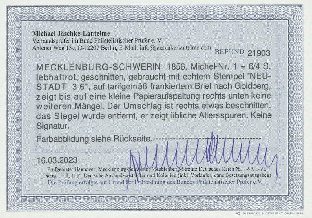 | Zusatzinformationen und Suchstichworte: | Ulrich Felzmann 178. Auktion 22. Juni 2023 Los 2564 Altdeutschland Mecklenburg Schwerin 6/4 S in ringsum gleichmäßig breitrandigem Schnitt mit lediglich rechts unten kleinem Eckfehler, farbfrisch mit zweifach aufsitzendem, klarem L2 NEUSTADT 3 6 tarifrichtig auf rechts etwas verkürztem Kuvert nach Goldberg, rs. Siegel entfernt, Fotobefund Jäschke-L. BPP Ausruf 100,00 EUR |