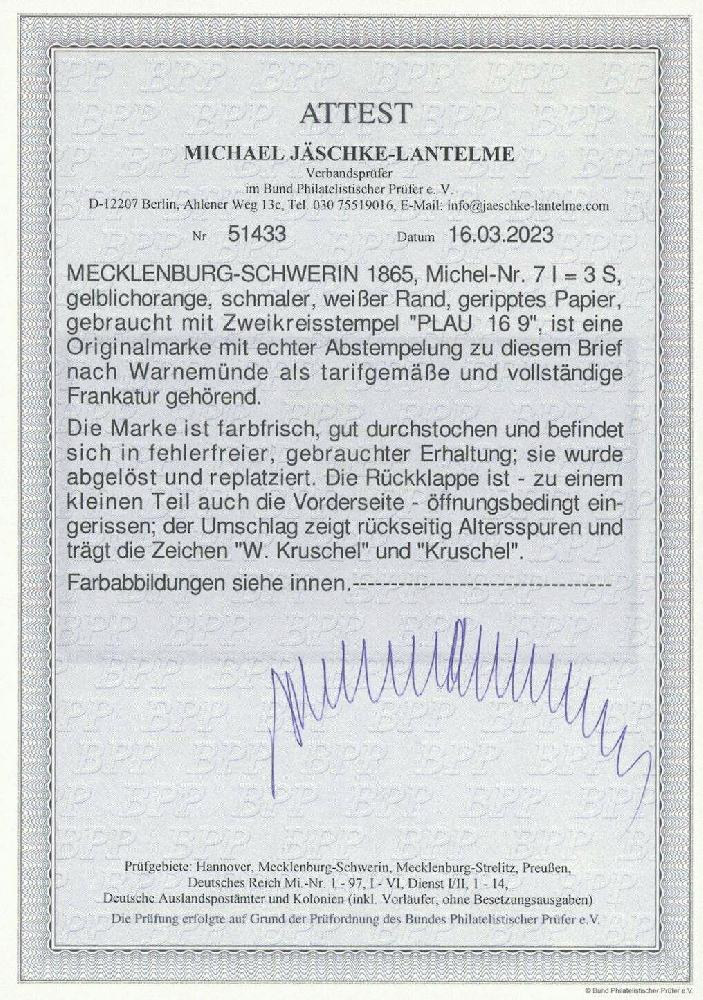 | Zusatzinformationen und Suchstichworte: | Ulrich Felzmann 178. Auktion 22. Juni 2023 Los 2570 Altdeutschland Mecklenburg Schwerin 3 S gelborange Erstauflage, herrlich farbfrisch mit tadellos gelungener Durchstichtrennung sowie voll und ideal klar aufsitzendem K2 PLAU 16 9 in fehlerfreier Kabinetterhaltung, tarifrichtig auf rs. etwas rau geöffnetem blauem Kuvert nach Warnemünde, sign. Kruschel sowie Fotoattest Jäschke-L. BPP, € 1.000,- Ausruf 250,00 EUR |