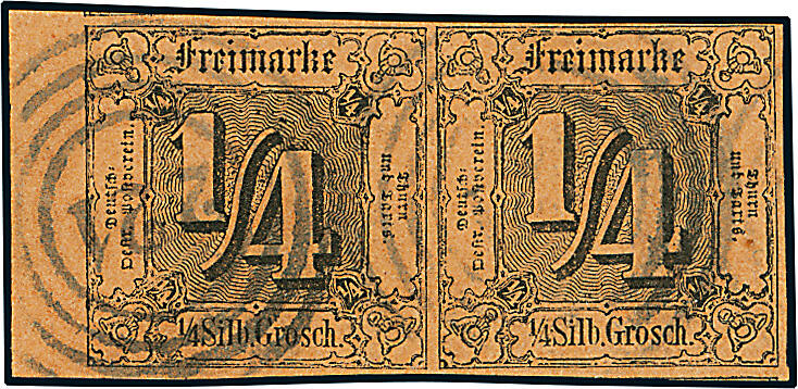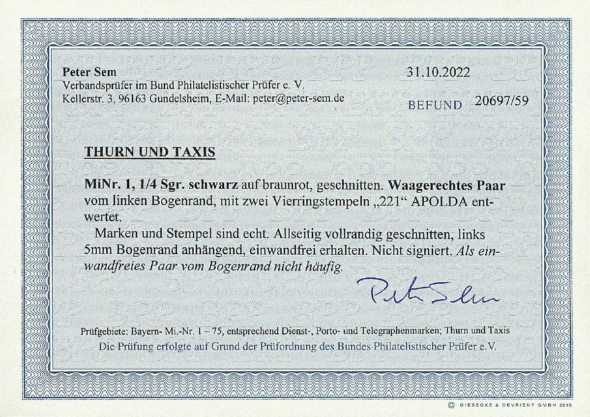 | Zusatzinformationen und Suchstichworte: | Dr. Derichs 170. Auktion 3. Juni 2023 Los 1285 Altdeutschland Thurn und Taxis 1/4 Sgr. schw./braunrot, waagerechtes Paar mit Nummernstempel "221" APOLDA, links mit 5mm breitem Bogenrand und an den anderen drei Seiten überall voll- bis überrandig mit Teilen bzw. Ansätzen von drei Nachbarmarken. Luxus. Neuer Fotobefund Sem BPP: "einwandfrei erhalten... Als einwandfreies Paar vom Bogenrand nicht häufig.". Zuschlag 100,00 EUR |