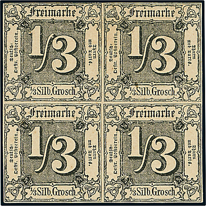 | Zusatzinformationen und Suchstichworte: | Dr. Derichs 170. Auktion 3. Juni 2023 Los 1288 Altdeutschland Thurn und Taxis 1/3 Sgr. schw./graubraun, ringsum vollrandiger, ungebrauchter Viererblock mit vollständiger Originalgummierung. Luxus. Fotoattest Hunziker und neuer Fotobefund Sem BPP: "einwandfrei erhalten". (Michel 550.-+). Zuschlag 150,00 EUR |