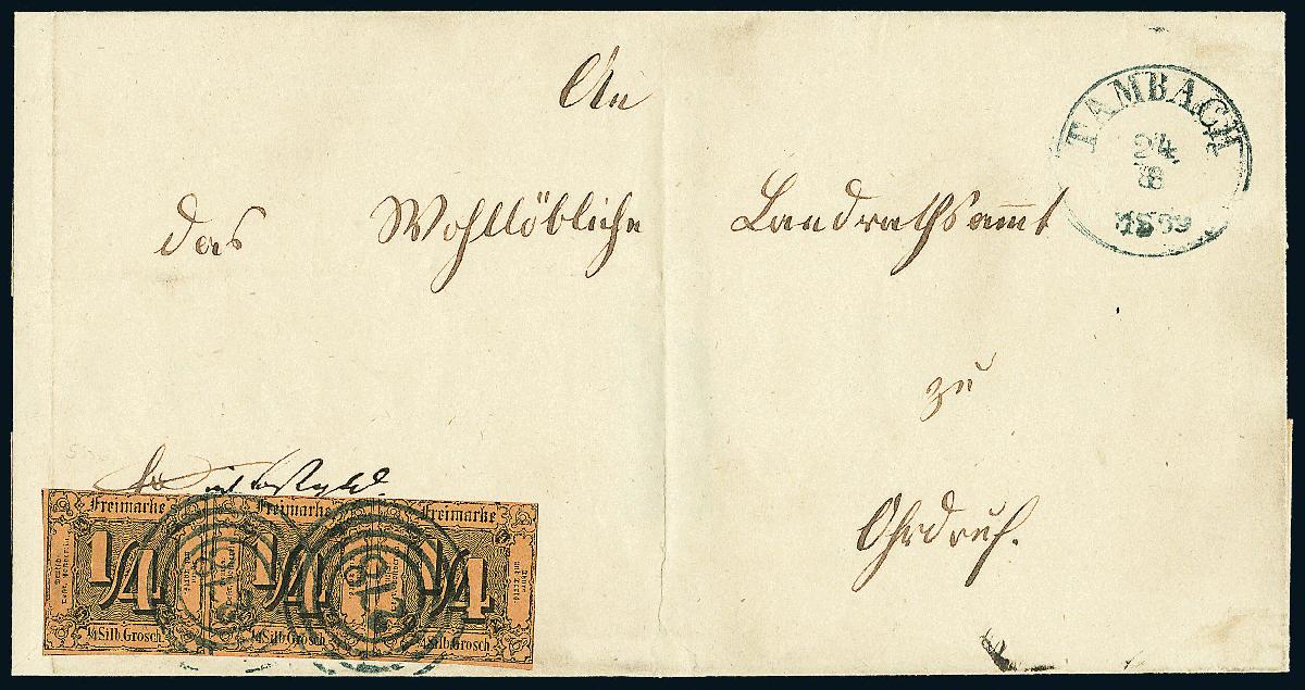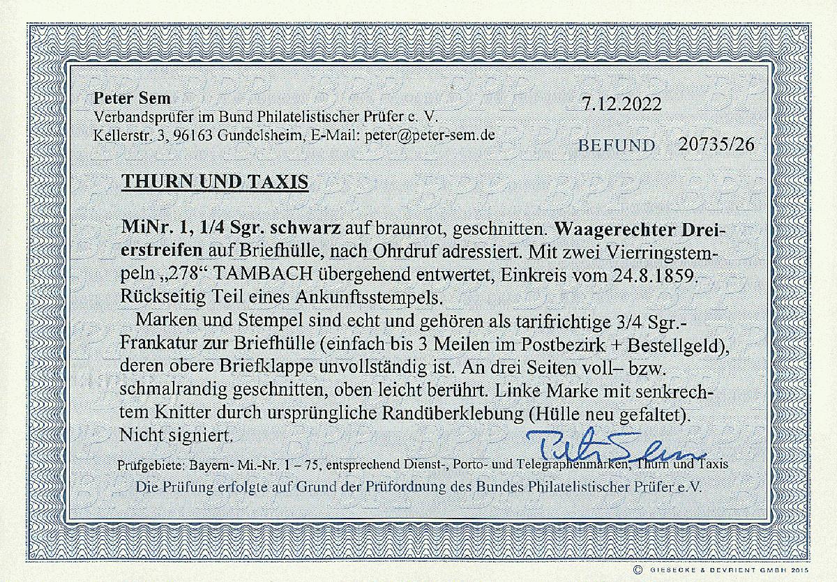 | Zusatzinformationen und Suchstichworte: | Dr. Derichs 170. Auktion 3. Juni 2023 Los 1289 Altdeutschland Thurn und Taxis 1/4 Sgr. schw./braunrot, waagerechter Dreierstreifen, oben leicht berührt, an den anderen drei Seiten voll- bis überrandig mit Ansätzen von zwei Nachbarmarken, linke Marke mit senkrechtem Knitter durch ursprüngliche Randüberklebung (Briefhülle dort neu gefaltet), mit zweimal aufgesetztem Nummernstempel "278" in Schwarzblau und Neben-K1 "Tambach 24/8 1859" in gleicher Stempelfarbe nach Ohrdruf. Ein attraktiver Streifen-Brief mit der Michelnummer 1 des Sammelgebietes. Neuer Fotobefund Sem BPP. Zuschlag 220,00 EUR |