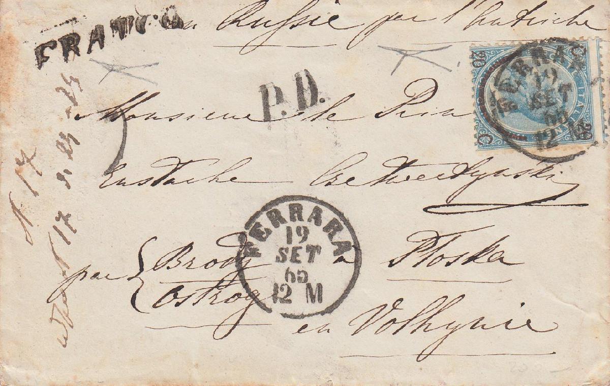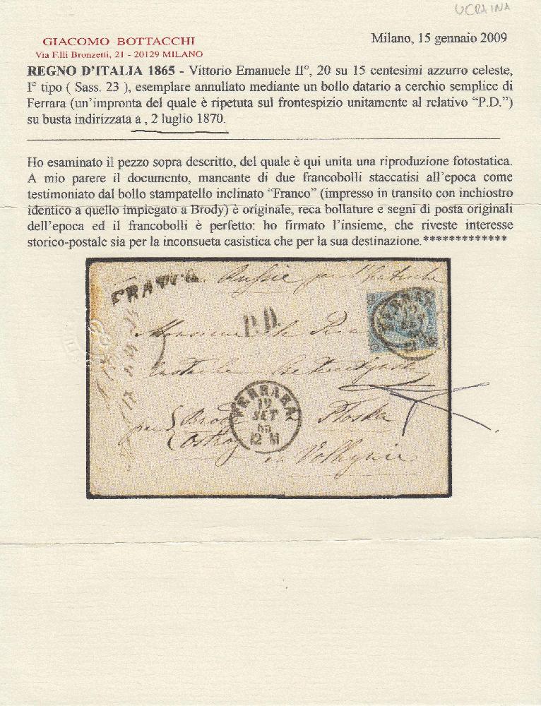 | Zusatzinformationen und Suchstichworte: | Versuch einer Übersetzung: KÖNIGREICH ITALIEN 1865 - Vittorio Emanuele II., 20 auf 15 Cent himmelblau, Typ I (Sass. 23), Exemplar mit einem einfachen Kreis-Datumsstempel von Ferrara (dessen Abdruck auf der Titelseite zusammen mit dem zugehörigen "PD") auf einem Umschlag vom 2. Juli 1870. Ich habe das oben beschriebene Stück untersucht, von dem hier eine photostatische Reproduktion beigefügt ist. Meiner Meinung nach ist das Dokument, in dem zwei Briefmarken fehlen, die zu diesem Zeitpunkt abgenommen wurden, wie der geneigte Block "Franco" (während des Transports mit Tinte gedruckt, die mit der in Brody verwendeten identisch ist) belegt, original, trägt Originalstempel und Poststempel der Zeit und die Briefmarke ist perfekt: Ich habe das Ganze signiert, das sowohl für die ungewöhnliche Fallgeschichte als auch für den Bestimmungsort von historisch-postalischem Interesse ist. |