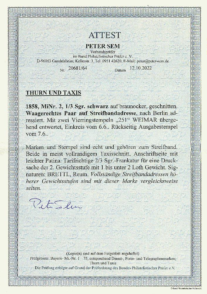 | Zusatzinformationen und Suchstichworte: | Dr. Derichs 170. Auktion 3. Juni 2023 Los 1295 Altdeutschland Thurn und Taxis 1/3 Sgr. schw./braunocker, waagerechtes Paar in meist vollrandigem Taxisschnitt auf kleiner Streifbandschleife mit Nummernstempeln "251" und Aufgabe-K1 "Weimar 6/6" an die Königliche Bibliothek nach Berlin (Anschriftseite leichte "Patina"). Tarifrichtige 2/3-Silbergroschen-Frankatur für eine Drucksache der zweiten Gewichtsstufe. Neues Fotoattest Sem BPP: "Vollständige Streifbandadressen höherer Gewichtsstufen sind mit dieser Marke vergleichsweise selten.". (Michel 1.500.-). Zuschlag 550,00 EUR |