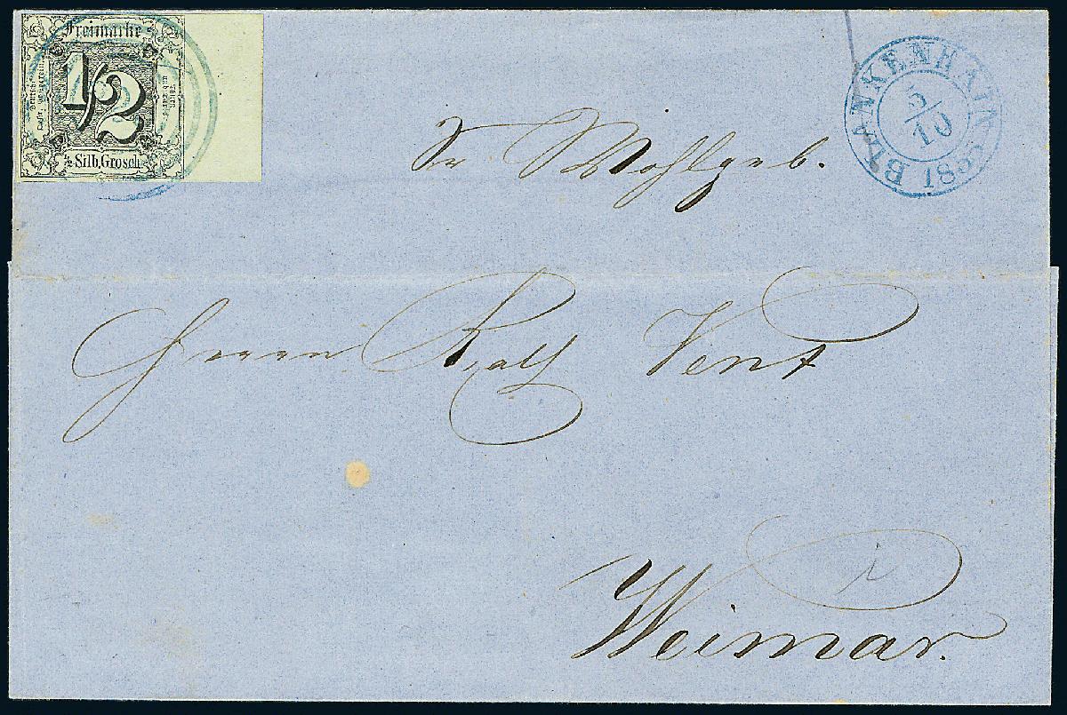| Zusatzinformationen und Suchstichworte: | Dr. Derichs 170. Auktion 3. Juni 2023 Los 1297 Altdeutschland Thurn und Taxis 1/2 Sgr. schw./graugrün, rechtes Randstück mit 10,5mm breitem Bogenrand, sonst meist vollrandig geschnitten und nur links oben gering berührt, auf Brief mit gutem blauen Nummernstempel "225" (Handbuch = 250.-) und ebenfalls blauem Neben-K2 "Blankenhain 5/10 1855" nach Weimar. Ein attraktiver Brief mit großem Randstück und seltenem farbigen Nummernstempel. Neuer Fotobefund Sem BPP. Zuschlag 140,00 EUR |