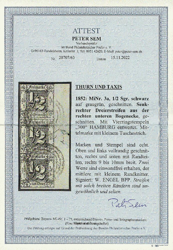 | Zusatzinformationen und Suchstichworte: | Dr. Derichs 170. Auktion 3. Juni 2023 Los 1299 Altdeutschland Thurn und Taxis \DREIERSTREIFEN AUS DER BOGENECKE\: 1/2 Sgr. schw./graugrün, senkrechter Dreierstreifen aus der rechten unteren Bogenecke, unten mit kleinem Randteil und rechts mit 9 bis 10mm breitem Bogenrand bei allen drei Marken, oben und links ebenfalls vollrandig geschnitten, typisch gestempelt mit zwei Abschlägen des Nummernstempels "300" HAMBURG. Mittlere Marke mit kleinem Randknitter und Tuschestrich, die beiden anderen Marken völlig einwandfrei. Fotoattest "Bremer Kartei" (1968) und neues Fotoattest Sem BPP: "Streifen mit solch breiten Rändern sind ungewöhnlich und selten.". Zuschlag 340,00 EUR |