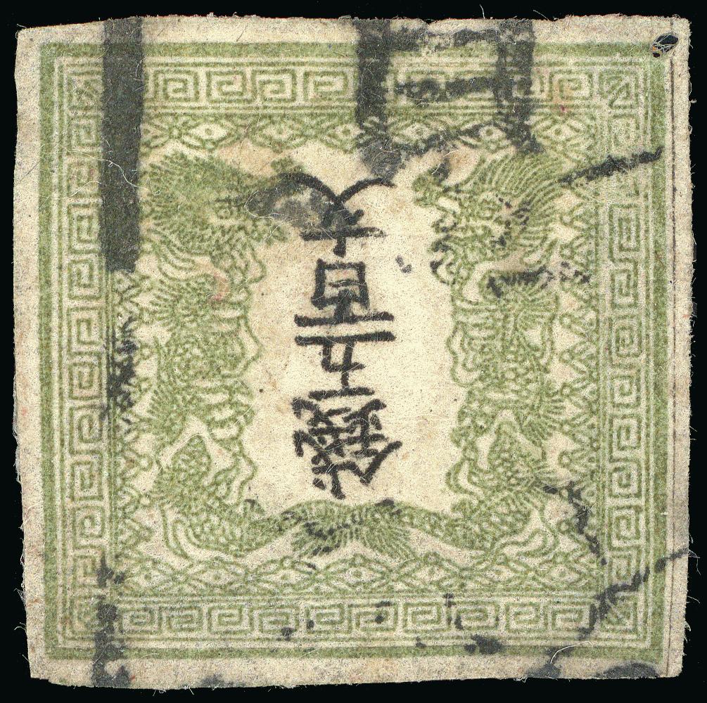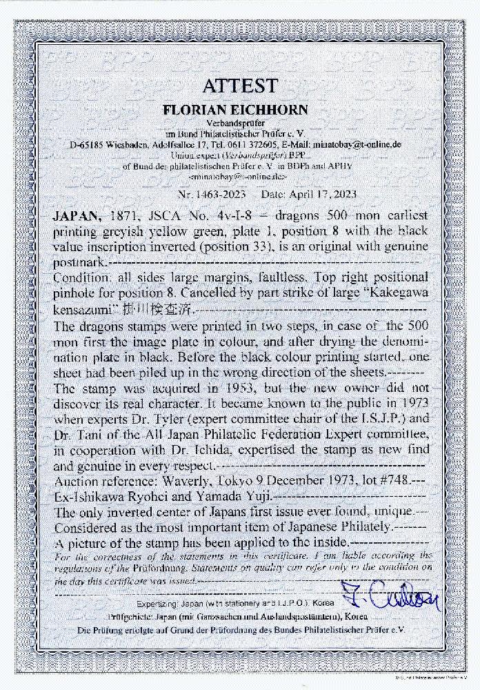 | Zusatzinformationen und Suchstichworte: | David Feldmann 03.Juni 2023 Los 30070 1871, 500 Mon, graugelbgrün, früheste Bedruckung, Tafel 1, Position 8 von der oberen rechten Bogenecke, Mitte seitenverkehrt, dies sind die Zeichen des schwarz gedruckten Nennwerts, die von Position 33 stammen. Es zeigt einen detaillierten Eindruck und einen tiefen Farbton, der rundum große, gleichmäßige Ränder besitzt. Es wurde leicht gestempelt und mit einem Teilstempel des großen "Kakegawa Kensazumi"-Stempels versehen, so dass der Fehler deutlich ausgestellt werden konnte. Positionslochblende in der oberen rechten Ecke, die gelegentlich in klassischen Briefmarken Japans zu finden ist und überhaupt kein Fehler ist, da sie vom Drucker in vier Ecken des Bogens angebracht wurde, um eine Reihe von Blättern zu fixieren, die gleichzeitig geschnitten oder perforiert werden sollten. Der Fehler wird auf der ursprünglichen Ausstellungsseite seines Vorbesitzers dargestellt, wie er gezeigt wurde, als seine Sammlung von "Japan 1871-1876 Hand Engraved Issues" auf der Philanippon 2021 mit einem "Grand Prix National" ausgezeichnet wurde. Dieses Juwel wird von zwei weiteren 500 mon zum Vergleich begleitet, die beide von der gleichen Position 8 ausgehen, wobei die Mitte korrekt gedruckt ist, und Zwischen- und Spätdrucke in kontrastierenden Farbtönen zeigen, wobei ersterer unbenutzt ist, während letzterer durch den "Kopfteil" des großen "Nishioji Kensazumi"-Stempels entwertet wurde. Das einzigartige Beispiel des einzigen umgekehrten Zentrums des klassischen Japans, das unbestreitbar das wichtigste und wertvollste Stück der japanischen und asiatischen Philatelie sowie eines der zehn wichtigsten Objekte der weltweiten Philatelie ist. Im Gegensatz zu anderen sehr großen Raritäten der Welt ist diese Marke tadellos und in einem sehr schönen Zustand erhalten. Anmerkung: Die 500 mon Briefmarke wurde in einem zweiteiligen Druckverfahren hergestellt. Zunächst wurde die Platte mit den Drachen und der Rahmen farbig gedruckt, nach dem Trocknen wurde die Platte des Nennwerts schwarz gedruckt. Vor diesem zweiten Schritt war offenbar ein Blatt verkehrt herum gestapelt. Die Echtheit des Fehlers ist unwiderlegbar, da die Plattenpositionen der Drachen &; des Rahmens in Grün, Position 8, und des Nennwerts in Schwarz, Position 33, die sich in der oberen rechten Ecke (8) und der unteren linken Ecke (33) des Blattes von 40 befinden, genau in eine Linie fielen, als das Blatt versehentlich verkehrt herum gedruckt wurde. Sachkenntnis: Der Fehler wurde irgendwann zwischen 1953 und 1973 von John C. Linsley entdeckt, einem amerikanischen Sammler, der den Fehler in einer von ihm erworbenen Japan-Sammlung fand. Der Irrtum wurde öffentlich, als sein Stiefsohn den Stempel 1973 zur Zertifizierung einreichte. Es wurde dann bei der Internationalen Gesellschaft für Japanische Philatelie (I.S.J.P.) Expert Committee und wurde von Dr. Varro E. Tyler (auch Vorsitzender des Expertenkomitees der American Philatelic Society) begutachtet. Vor der Ausstellung eines Zertifikats wollte die I.S.J.P. die zusätzliche Meinung von Dr. Tani Takashi vom Expertenkomitee der All Japan Philatelic Federation und Dr. Soichi Ichida von der Study Group of Hand Engraved Stamps einholen. Alle Experten kamen mit vollem Vertrauen zu dem Schluss, dass dieser Stempel echt ist. Das Zertifikat ist seitdem leider verschollen, aber die Signatur "Tyler" von Dr. Varro E. Tyler ist auf der Rückseite in der unteren rechten Ecke mit Bleistift versehen Zuschlag 4.400.000,00 EUR |