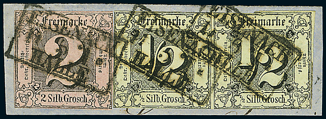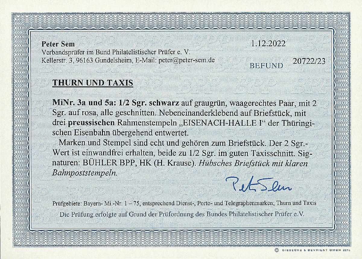 | Zusatzinformationen und Suchstichworte: | Dr. Derichs 170. Auktion 3. Juni 2023 Los 1301 Altdeutschland Thurn und Taxis 1/2 Sgr. schw./graugrün, waagerechtes Paar in gutem Taxisschnitt zusammen mit einwandfreier 2 Sgr. schw./rosa auf Briefstück mit dreimal aufgesetztem preußischen Bahnpost-Ra3 "Eisenach/Halle". Attraktive Buntfrankatur mit seltener Fremdabstempelung. Neuer Fotobefund Sem BPP. Zuschlag 280,00 EUR |