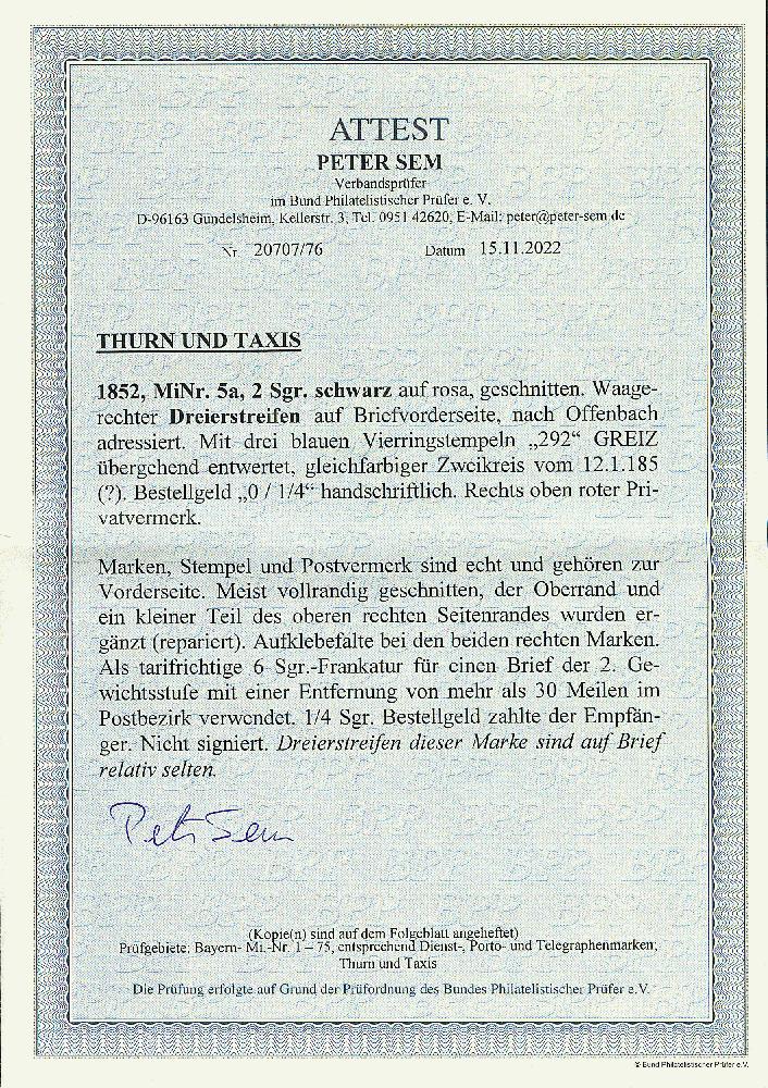 | Zusatzinformationen und Suchstichworte: | Dr. Derichs 170. Auktion 3. Juni 2023 Los 1309 Altdeutschland Thurn und Taxis 2 Sgr. schw./rosa, waagerechter Dreierstreifen (Oberrand und kleiner Teil des oberen rechten Seitenrandes ergänzt) auf Briefvorderseite mit leuchtend blauen Nummernstempeln "292" und Aufabe K2 "Greiz 12/1" nach Offenbach. Tarifrichtige 6-Silbergroschen-Frankatur für einen Brief der zweiten Gewichtsstufe mit einer Entfernung von mehr als 30 Meilen im Postbezirk. Neues Fotoattest Sem BPP: "Dreierstreifen dieser Marke sind auf Brief relativ selten." Zuschlag 160,00 EUR |