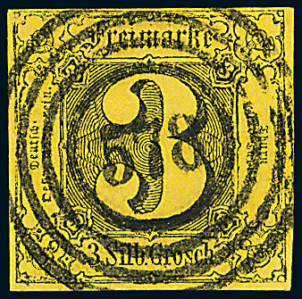 | Zusatzinformationen und Suchstichworte: | Dr. Derichs 170. Auktion 3. Juni 2023 Los 1317 Altdeutschland Thurn und Taxis 3 Sgr. schw./gelb, vierseitig voll- bis breitrandig mit zentrisch und ideal klar aufgesetztem Preußen-Nummernstempel "578" HAMBURG. Luxus. Neuer Fotobefund Sem BPP: "einwandfrei erhalten... Der sehr klar abgeschlagene Preußen-Stempel ist auf dieser Marke nicht häufig." Zuschlag 320,00 EUR |