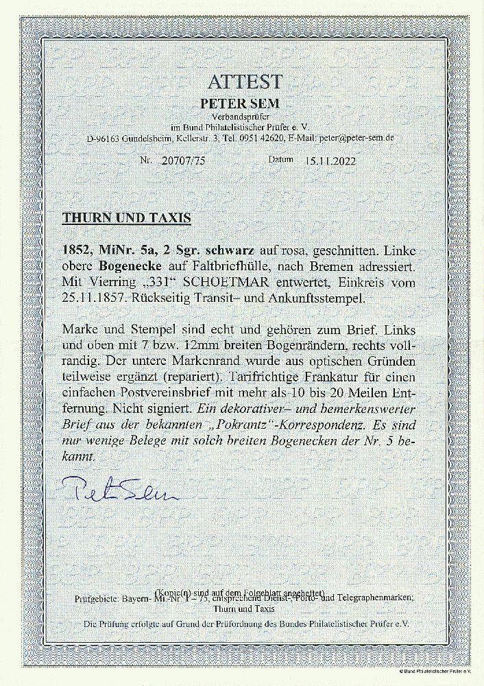 | Zusatzinformationen und Suchstichworte: | Dr. Derichs 170. Auktion 3. Juni 2023 Los 1320 Altdeutschland Thurn und Taxis \BOGENECKE OBEN LINKS\: 2 Sgr. schw./rosa, große linke obere Bogenecke mit 7mm Bogenrand links und 12mm oben, rechts vollrandig, Unterrand teilweis ergänzt, auf Brief mit Nummernstempel "331" und Aufgabe-K1 "Schoetmar 25.11.1857" nach Bremen an die Auswanderer-Agentur Pokrantz adressiert. Ein imposanter Bogenecken-Brief. Fotoattest Dr. Sommer BPP und neues Fotoattest Sem BPP: "Es sind nur wenige Belege mit solch breiten Bogenecken der Nr. 5 bekannt." Zuschlag 850,00 EUR |