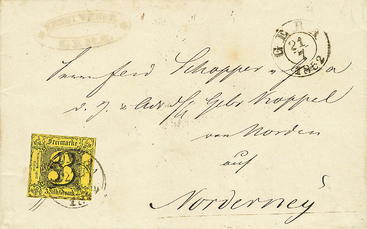 | Zusatzinformationen und Suchstichworte: | Dr. Derichs 170. Auktion 3. Juni 2023 Los 1323 Altdeutschland Thurn und Taxis \BRIEF AUF DIE INSEL NORDERNEY\: 3 Sgr. schw./gelb, vierseitig voll- bis breitrandig bzw. rechts sogar mit Ansatz der Nachbarmarke auf Brief mit Ortsstempel-Entwertung durch K2 "Gera 21/7 1852", dieser nochmals beigesetzt, auf die Insel Norderney gelaufen, rückseitig mit vier verschiedenen meist Bahnpost-Stempeln. Luxus. Neuer Fotobefund Sem BPP: "einwandfrei erhalten... Sauberer Brief mit ungewöhnlicher und seltener Destination!" Zuschlag 340,00 EUR |
