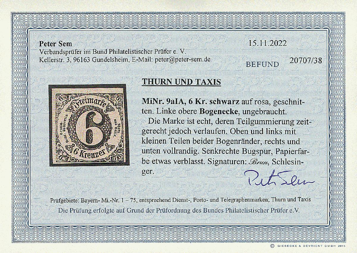 | Zusatzinformationen und Suchstichworte: | Dr. Derichs 170. Auktion 3. Juni 2023 Los 1325 Altdeutschland Thurn und Taxis LINKE OBERE BOGENECKE\: 6 Kr. schw./rosa, Type "IA", ungebraucht mit etwas verlaufener Originalgummierung, unbedeutende Bugspur und Papierfarbe etwas verblaßt, links und oben mit kleinen Bogenrändern und an den anderen beiden Seiten voll- bis breitrandig. Eine ungebraucht per se seltene Marke, die aus der Bogenecke eine Rarität darstellt. Neuer Fotobefund Sem BPP. (Michel 1.000.-+) Zuschlag 240,00 EUR |