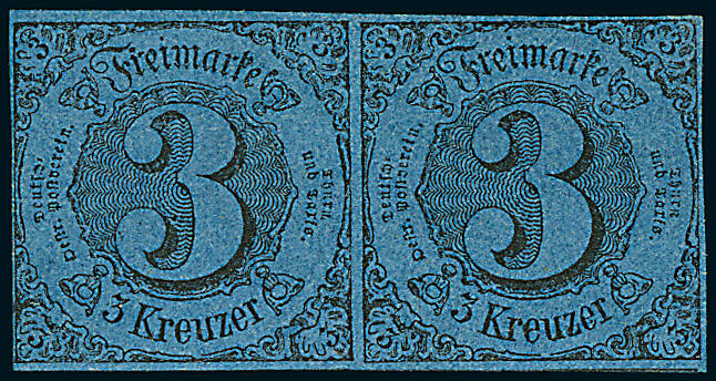 | Zusatzinformationen und Suchstichworte: | Dr. Derichs 170. Auktion 3. Juni 2023 Los 1327 Altdeutschland Thurn und Taxis 3 Kr. schw./blau, waagerechtes Paar, ungebraucht ohne Gummierung. Die Einheit ist ringsum voll- bis überrandig geschnitten mit Ansatz der rechten unteren Nachbarmarke. Eine kleine Papierpore ist laut Attest herstellungsbedingt und kein Mangel. Ein frisches Doppelstück. Neues Fotoattest Sem BPP: "einwandfrei erhalten... Ungestempelte Einheiten dieser Marke sind wegen des Fehlens von Restbeständen sehr selten.". (Michel 600.- für zwei ungummierte Einzelmarken bzw. 1.700.- für ein gummiertes Paar) Zuschlag 1.100,00 EUR |