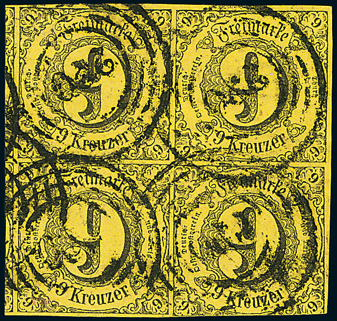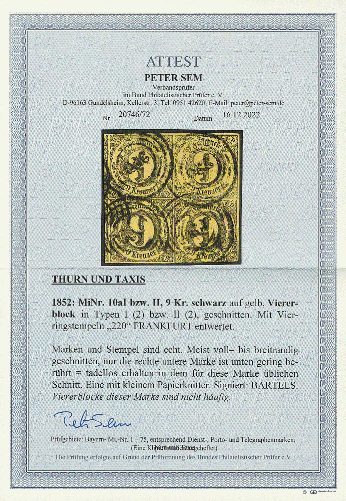 | Zusatzinformationen und Suchstichworte: | Dr. Derichs 170. Auktion 3. Juni 2023 Los 1330 Altdeutschland Thurn und Taxis 9 Kr. schw./gelb, Viererblock mit je zwei Marken in Type "I" und Type "II" (so im Michel nicht verzeichnet bzw. bewertet) mit Nummernstempeln "220" FRANKFURT/MAIN. Nur die rechte untere Marke ist unten gering berührt, sonst eine voll- bis überrandig geschnittene Einheit mit großen Teilen der beiden linken Nachbarmarken. Eine Marke mit kleinem Papierknitter und soweit einwandfrei. Neues Fotoattest Sem BPP: "Viererblöcke dieser Marke sind nicht häufig.". (Michel 1.400.-++, dabei kein Aufschlag für die Typen-Kombination gerechnet). Zuschlag 280,00 EUR |
