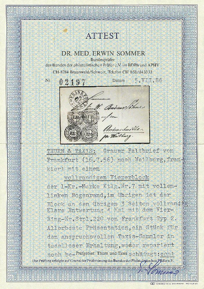 | Zusatzinformationen und Suchstichworte: | Dr. Derichs 170. Auktion 3. Juni 2023 Los 1332 Altdeutschland Thurn und Taxis 1 Kr. schw./graugrün, Viererblock vom linken Bogenrand (dieser 8mm breit), auch an den anderen drei Seiten überall voll- bis breitrandig geschnitten, auf Brief mit Nummernstempeln "220" und Aufgabe-K2 "Frankfurt 16 Jul.1856" nach Andenschmidten per Weilburg. Luxus-Qualität. Unberührte Blockstücke, noch dazu mit breitem Bogenrand wie hier, sind von diesem Sammelgebiet auf Brief nahezu unbekannt. Fotoattest Dr. Sommer BPP und neues Fotoattest Sem BPP: "einwandfrei erhalten... Ein ungewöhnlich attraktiver Brief mit Rand-Viererblock, der in tadelloser Erhaltung auf Briefen selten ist." Zuschlag 2.600,00 EUR |