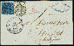 | Zusatzinformationen und Suchstichworte: | Dr. Derichs 170. Auktion 3. Juni 2023 Los 1342 Altdeutschland Thurn und Taxis \STUMMER VERSUCHSSTEMPEL VON FRANKFURT\: 1 Kr. schw./graugrün und 3 Kr. schw./blau, beide Marken voll- bis breitrandig und mit Ausnahme eines bereits vor dem Aufkleben vorhandenen waagerechten Knitters bei der 3-Kreuzer-Marke einwandfrei, auf Brief mit stummem Vierring-Versuchsstempel von Frankfurt auf jeder Marke einzeln als Entwerter sowie mit nebengesetztem K2 "Frankfurt 24 Nov.1852" nach Hersfeld. Dieser Versuchsstempel wurde in Frankfurt nur vom 8. bis 25. November 1852 verwendet. Er ist dementsprechend selten und auf einem so schönen Brief wie dem hier gezeigten als Thurn & Taxis-Rarität anzusprechen. Neues Fotoattest Sem BPP. (Sem-Handbuch = 2.000.-) Zuschlag 650,00 EUR |