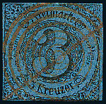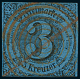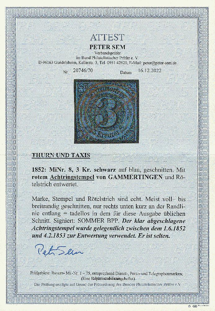 | Zusatzinformationen und Suchstichworte: | Dr. Derichs 170. Auktion 3. Juni 2023 Los 1343 Altdeutschland Thurn und Taxis \STUMMER ACHTRINGSTEMPEL "GAMMERTINGEN"\: 3 Kr. schw./blau, Schnitt rechts unten kurz an der Randlinie entlang und sonst überall voll- bis breitrandig, schön gestempelt mit stummem Achtringstempel von Gammertingen in leuchtendem Rot sowie mit diagonalem Rötelstrich. Eine der größten Stempelraritäten von Thurn & Taxis. Fotoattest Dr. Sommer BPP und neues Fotoattest Sem BPP: "tadellos in dem für diese Ausgabe üblichen Schnitt... Der klar abgeschlagene Achtringstempel wurde gelegentlich zwischen dem 1.6.1852 und 4.2.1853 zur Entwertung verwendet. Er ist selten.". (Michel nur für die Abstempelung = 2.500.- Zuschlag 900,00 EUR |