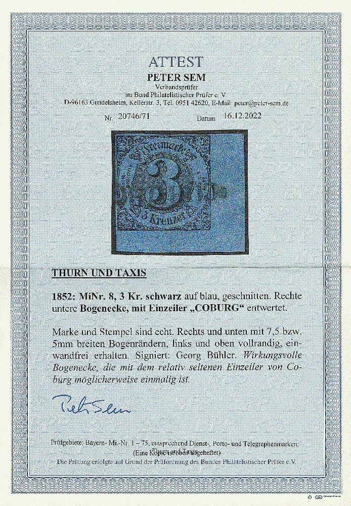 | Zusatzinformationen und Suchstichworte: | Dr. Derichs 170. Auktion 3. Juni 2023 Los 1345 Altdeutschland Thurn und Taxis \BOGENECKE UNTEN RECHTS\: 3 Kr. schw./blau, rechte untere Bogenecke mit 5mm Bogenrand unten und 7,5mm rechts, an den anderen beiden Seiten gleichmäßig vollrandig, mit als Markentwerter seltenem Einzeiler "Coburg". Luxus. Neues Fotoattest Sem BPP: "einwandfrei erhalten... Wirkungsvolle Bogenecke, die mit dem relativ seltenen Einzeiler von Coburg möglicherweise einmalig ist." Zuschlag 500,00 EUR |