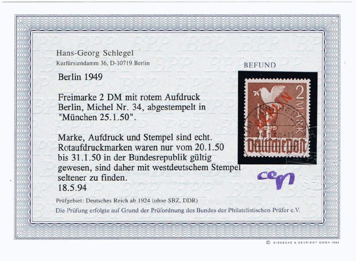 | Zusatzinformationen und Suchstichworte: | Berlin Rotaufdruck mit Stempel München |