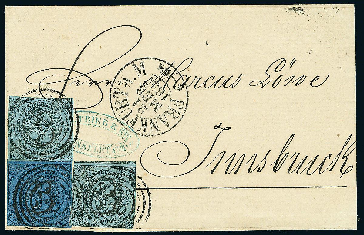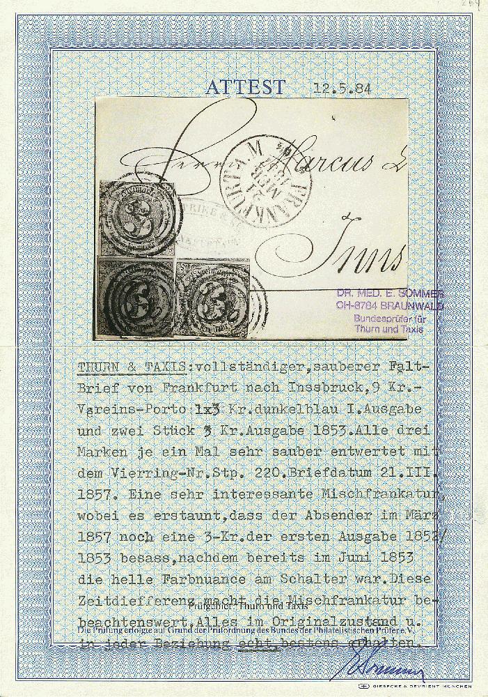 | Zusatzinformationen und Suchstichworte: | Dr. Derichs 170. Auktion 3. Juni 2023 Los 1346 Altdeutschland Thurn und Taxis \WERSTUFENGLEICHE MISCHFRANKATUR\: 3 Kr. schw./blau zusammen mit zweimal 3 Kr. schw./grünlichblau, alle drei Marken in gutem, teils überrandigen Taxisschnitt, auf Brief mit Nummernstempeln "220" und Aufgabe-K1 "Frankfurt a.M. 21 Mer.1857" nach Innsbruck/Österreich. Eine äußerst seltene Mischfrankatur gleicher Wertstufen in unterschiedlichen Farben/Farbnuancen. Fotoattest Dr. Sommer BPP und neues Fotoattest Sem BPP: "Der sehr attraktive Brief mit seltener Frankatur zweier tarifgleicher Ausgaben ist frisch erhalten." Zuschlag 1.700,00 EUR |