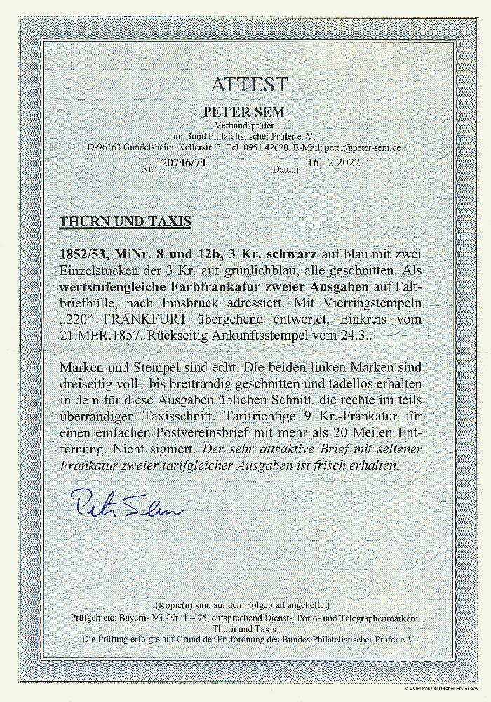 | Zusatzinformationen und Suchstichworte: | Dr. Derichs 170. Auktion 3. Juni 2023 Los 1346 Altdeutschland Thurn und Taxis \WERSTUFENGLEICHE MISCHFRANKATUR\: 3 Kr. schw./blau zusammen mit zweimal 3 Kr. schw./grünlichblau, alle drei Marken in gutem, teils überrandigen Taxisschnitt, auf Brief mit Nummernstempeln "220" und Aufgabe-K1 "Frankfurt a.M. 21 Mer.1857" nach Innsbruck/Österreich. Eine äußerst seltene Mischfrankatur gleicher Wertstufen in unterschiedlichen Farben/Farbnuancen. Fotoattest Dr. Sommer BPP und neues Fotoattest Sem BPP: "Der sehr attraktive Brief mit seltener Frankatur zweier tarifgleicher Ausgaben ist frisch erhalten." Zuschlag 1.700,00 EUR |