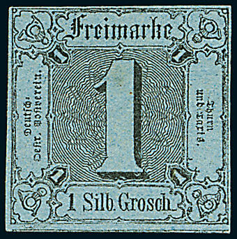 | Zusatzinformationen und Suchstichworte: | Dr. Derichs 170. Auktion 3. Juni 2023 Los 1347 Altdeutschland Thurn und Taxis 1 Sgr. schw./mittelblau, ungebraucht ohne Gummierung, vierseitig voll- bis breitrandig bzw. unten sogar auf voller Länge mit Ansatz der Nachbarmarke. Eine kleine Papierpore ist herstellungsbedingt und kein Mangel. Luxus-Qualität. Eine ungebraucht seltene Marke. Neuer Fotobefund Sem BPP: "einwandfrei erhalten". (Michel 300.-) Zuschlag 340,00 EUR |