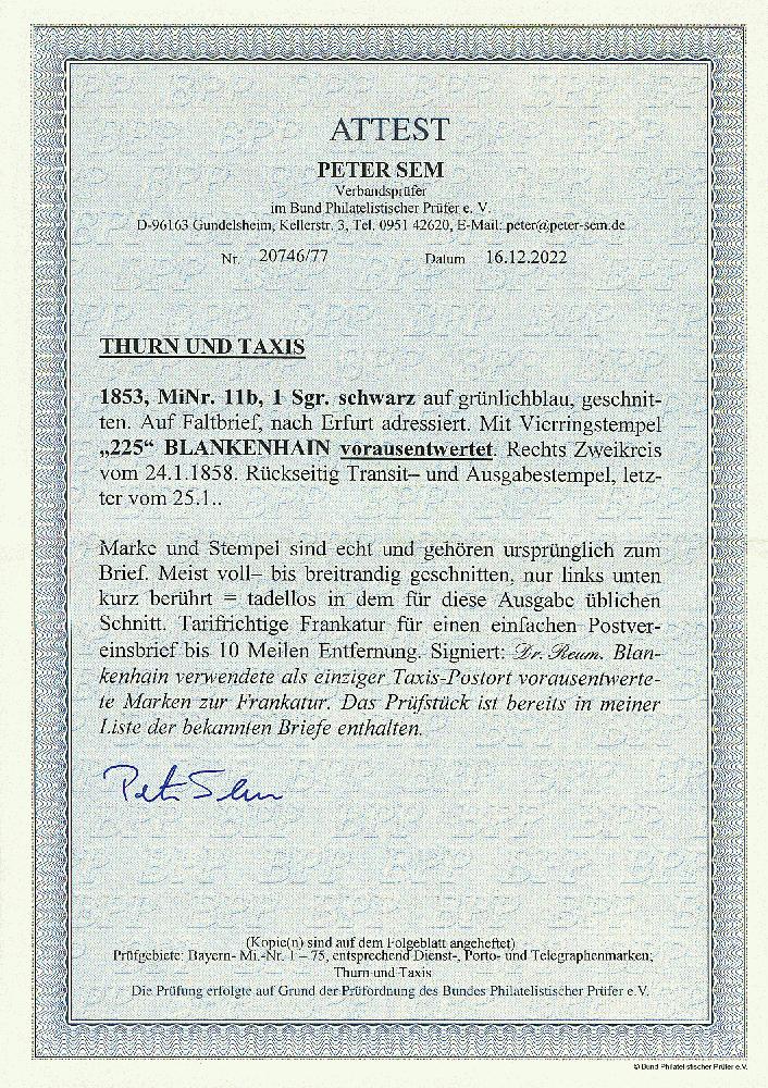 | Zusatzinformationen und Suchstichworte: | Dr. Derichs 170. Auktion 3. Juni 2023 Los 1355 Altdeutschland Thurn und Taxis \VORAUSENTWERTUNG\: 1 Sgr. schw./grünlichblau, nur links unten kurz berührt und sonst voll- bis überrandig auf Brief mit Vorausentwertung durch ideal aufgesezten Nummernstempel "225" und mit Aufgabe-K2 "Blankenhain 24/1 1858" nach Erfurt/Königreich Preußen. Neues Fotoattest Sem BPP: "tadellos in dem für diese Ausgabe üblichen Schnitt... Blankenhain verwendete als einziger Taxis-Postort vorausentwertete Marken zur Frankatur. Das Prüfstück ist bereits in meiner Liste der bekannten Briefe enthalten.". (Handbuch = 2.000.-) Zuschlag 750,00 EUR |