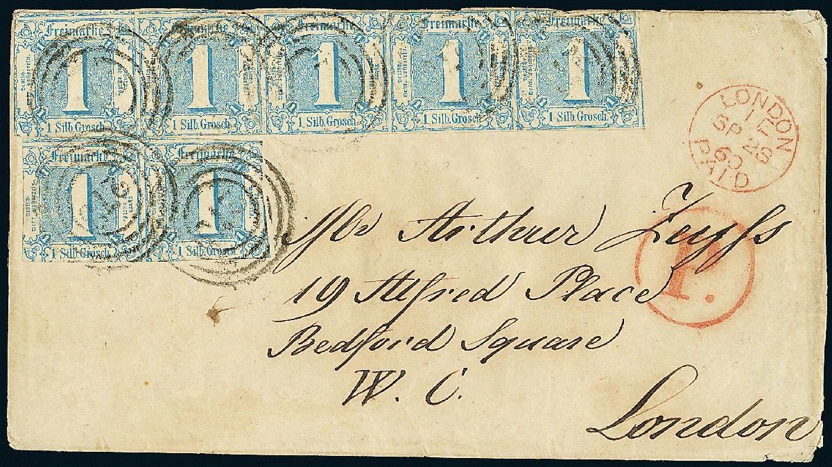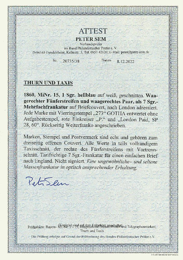 | Zusatzinformationen und Suchstichworte: | Dr. Derichs 170. Auktion 3. Juni 2023 Los 1368 Altdeutschland Thurn und Taxis 1 Sgr. blau, waagerechter Fünferstreifen und waagerechtes Paar, alle Marken in teils vollrandigem Taxisschnitt (rechte Marke des Streifens mit Vortrennschnitt), auf dreiseitig geöffnetem Briefkuvert mit Nummernstempeln "273" GOTHA (ohne Aufgabestempel) nach London/Großbritannien, nebengesetzt rote Einkreisstempel "P." und "London Paid SP 23 60". Tarifrichtige und beeindruckende 7-Silbergroschen-Frankatur für einen einfachen Brief nach England. Neues Fotoattest Sem BPP: "Eine ungewöhnliche und seltene Massenfrankatur in optisch ansprechender Erhaltung.". Anmerkung: Eine ähnliche Frankatur mit der 1 Silbergroschen "I. Ausgabe" wurde in der ersten Rheinländer-Auktion von 750 Euro auf 5.500 Euro gesteigert Zuschlag 2.800,00 EUR |