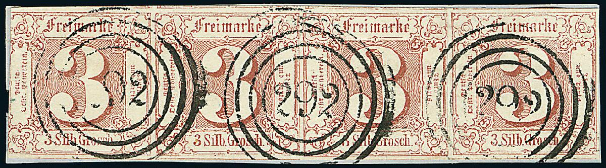 | Zusatzinformationen und Suchstichworte: | Dr. Derichs 170. Auktion 3. Juni 2023 Los 1373 Altdeutschland Thurn und Taxis 3 Sgr. braunrot, waagerechter Vierererstreifen, linke Marke links berührt, die drei anderen sind einwandfrei und überall voll- bis meist überrandig geschnitten (insgesamt zeigt die Einheit Ansätze von sieben Nachbarmarken), auf Briefstück mit dreimal aufgesetztem Nummernstempel "292" GREIZ. Ein seltener Streifen. Fotoattest Dr. Sommer BPP und neues Fotoattest Sem BPP: "Eine bemerkenswert frische Einheit, die in diesem guten Schnitt selten ist.". (Michel 750.-) Zuschlag 230,00 EUR |