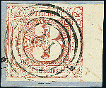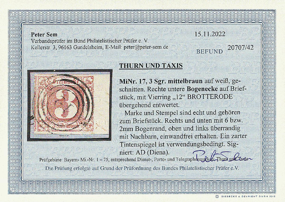 | Zusatzinformationen und Suchstichworte: | Dr. Derichs 170. Auktion 3. Juni 2023 Los 1374 Altdeutschland Thurn und Taxis \BOGENECKE UNTEN RECHTS\: 3 Sgr. mittelbraun, rechte untere Bogenecke, unten mit 2mm und rechts mit 6mm Bogenrand, an den anderen beiden Seiten überrandig mit Teilen aller drei möglichen Nachbarmarken, auf Briefstück (zarter verwendungsbedingter Tintenspiegel ist kein Mangel) mit klarem Nummernstempel "12" BROTTERODE. Luxus. Ein Rekordstück dieser Marke, das auf einer Stufe mit einem "Kleinen Neunerblock" steht. Neuer Fotobefund Sem BPP: "einwandfrei erhalten Zuschlag 300,00 EUR |