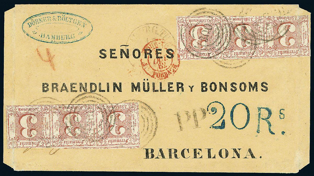 | Zusatzinformationen und Suchstichworte: | Dr. Derichs 170. Auktion 3. Juni 2023 Los 1376 Altdeutschland Thurn und Taxis \DESTINATION "SPANIEN"\: 3 Sgr. braunrot, zwei waagerechte Dreierstreifen auf braungelbem Vordruckkuvert mit Nummernstempeln "300" und Aufgabe-K1 "Hamburg Th.& T. 15.10.1862" nach Barcelona/Spanien, nebengesetzt roter französischer Grenzübergangsstempel, schwarzer "PP" und blauer spanischer Tax-Stempel "20 Rs.". Die Briefecken sind oktogonal beschnitten. Meist voll- bis breitrandiger Taxisschnitt bei beiden Streifen, jeweils leicht tangiert und jeweils Bug in einer Marke. Tarifrichtige 18-Silbergroschen-Frankatur für einen Brief der 2. Gewichtsstufe im Postverein und der 4. Gewichtsstufe über Frankreich mit 6 Silbergroschen für den Postverein und 12 Silbergroschen Weiterfranko, weitere 20 Reales zahlte der Empfänger. Fotoattest Dr. Sommer BPP und neues Fotoattest Sem BPP: "Wirkungsvolle Massenfrankatur aus bekannter Korrespondenz. Als 18 Sgr.-Franko selten." Zuschlag 700,00 EUR |