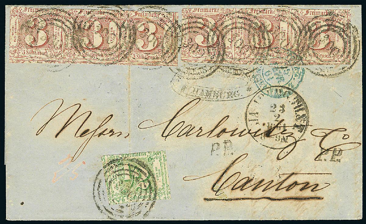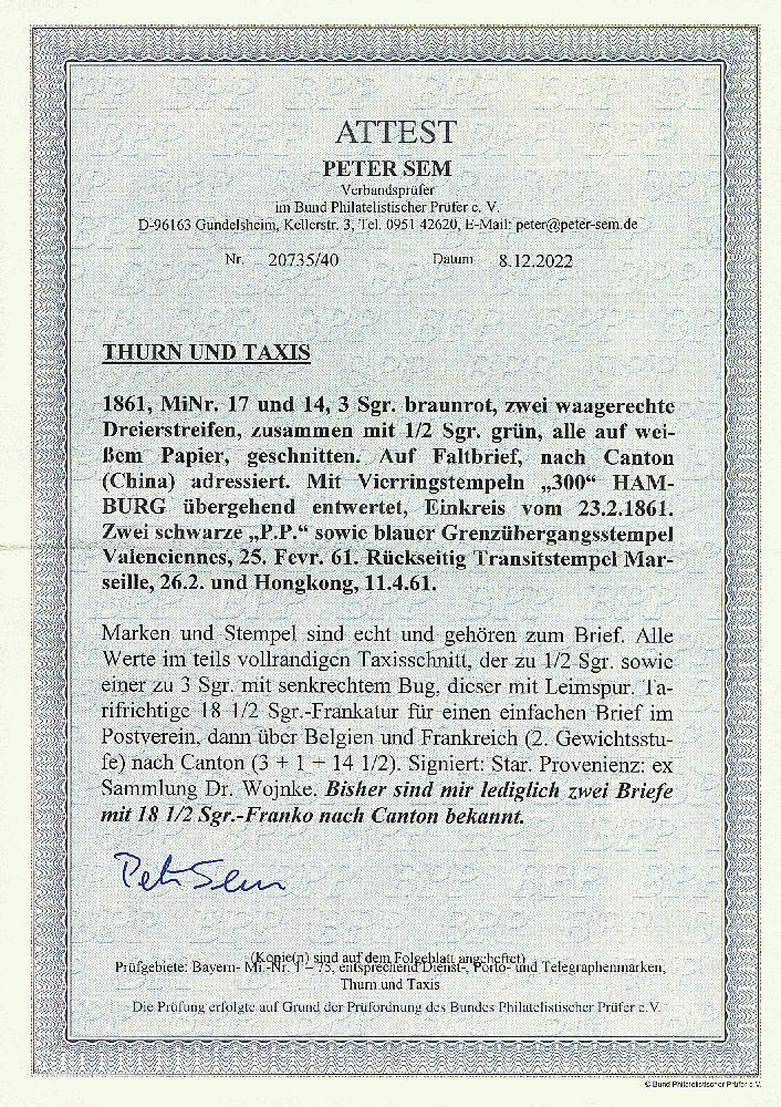 | Zusatzinformationen und Suchstichworte: | Dr. Derichs 170. Auktion 3. Juni 2023 Los 1377 Altdeutschland Thurn und Taxis \DESTINATION "CANTON - CHINA"\: 3 Sgr. braunrot, zwei waagerechte Dreierstreifen zusammen mit 1/2 Sgr. grün, alle Marken im teils vollrandigen Taxisschnit und die 1/2 Silbergroschen sowie eine 3 Silbergroschen mit senkrechtem Bug (diese mit Leimspur), auf Brief mit Nummernstempeln "300" und Aufgabe-K1 "Hamburg. Th.& T. 23.2.1861" via Frankreich mit vorderseitigem blauen Grenzübergangsstempel und zweimal aufgesetztem schwarzen "P.P." nach Canton/China, rückseitig mit Transitstempeln von Marseille und Hong-Kong. Tarifrichtige 18 1/2-Silbergroschen-Frankatur für einen einfachen Brief im Postverein, dann über Belgien und Frankreich (dort 2. Gewichtsstufe) nach Canton gelaufen. Ein beeindruckender Übersee-Brief. Neues Fotoattest Sem BPP: "Bisher sind mir lediglich zwei Briefe mit 18 1/2 Sgr.-Franko nach Canton bekannt." Zuschlag 2.200,00 EUR |