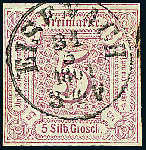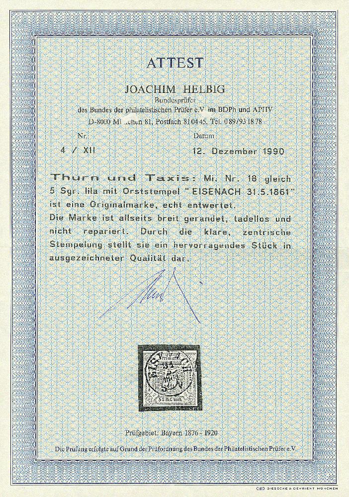 | Zusatzinformationen und Suchstichworte: | Dr. Derichs 170. Auktion 3. Juni 2023 Los 1379 Altdeutschland Thurn und Taxis 5 Sgr. braunpurpur, vierseitig breit- bis überrandig, oben auf voller Länge mit Ansatz der Nachbarmarke, mit zentrisch, klar und gerade aufgesetztem K1 "Eisenach 31.5.1861". Luxus. Fotoattest Dr. Helbig BPP und neuer Fotobefund Sem BPP: "einwandfrei erhalten... Eine in dieser Qualität vergleichsweise seltene Marke.". (Michel 300.-++) Zuschlag 300,00 EUR |