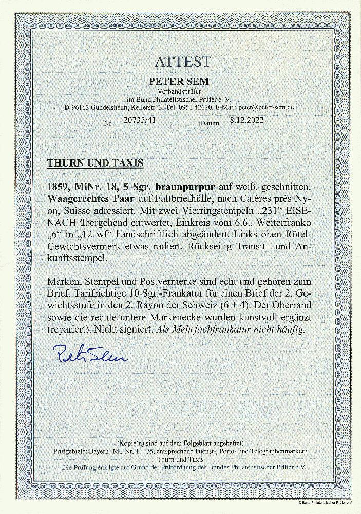 | Zusatzinformationen und Suchstichworte: | Dr. Derichs 170. Auktion 3. Juni 2023 Los 1384 Altdeutschland Thurn und Taxis 5 Sgr. braunpurpur, waagerechtes Paar (Oberrand sowie rechte untere Markenecke kunstvoll ergänzt) auf Brief mit Nummernstempeln "231" und Neben-K1 "Eisenach 6/6" (1865) nach Caleres bei Nyon/Kanton Waadt/Schweiz. Tarifrichtige 10-Silbergroschen-Frankatur für einen Brief der zweiten Gewichtsstufe in den 2. Rayon der Schweiz mit 6 Silbergroschen für den Postverein und 4 Silbergroschen Weiterfranko. Mehrfachfrankaturen dieser hohen Wertstufe ohne weitere Zusatzfrankatur sind selten. Fotoattest Nickel BPP und neues Fotoattest Sem BPP. Zuschlag 420,00 EUR |