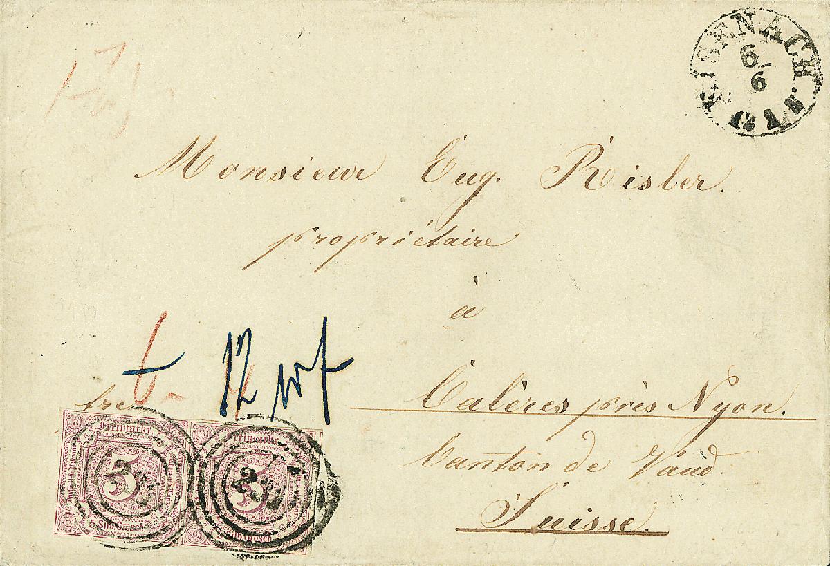 | Zusatzinformationen und Suchstichworte: | Dr. Derichs 170. Auktion 3. Juni 2023 Los 1384 Altdeutschland Thurn und Taxis 5 Sgr. braunpurpur, waagerechtes Paar (Oberrand sowie rechte untere Markenecke kunstvoll ergänzt) auf Brief mit Nummernstempeln "231" und Neben-K1 "Eisenach 6/6" (1865) nach Caleres bei Nyon/Kanton Waadt/Schweiz. Tarifrichtige 10-Silbergroschen-Frankatur für einen Brief der zweiten Gewichtsstufe in den 2. Rayon der Schweiz mit 6 Silbergroschen für den Postverein und 4 Silbergroschen Weiterfranko. Mehrfachfrankaturen dieser hohen Wertstufe ohne weitere Zusatzfrankatur sind selten. Fotoattest Nickel BPP und neues Fotoattest Sem BPP. Zuschlag 420,00 EUR |