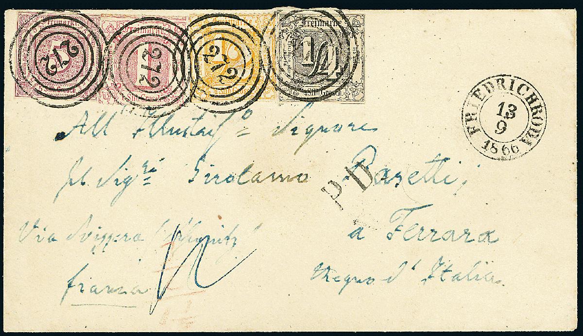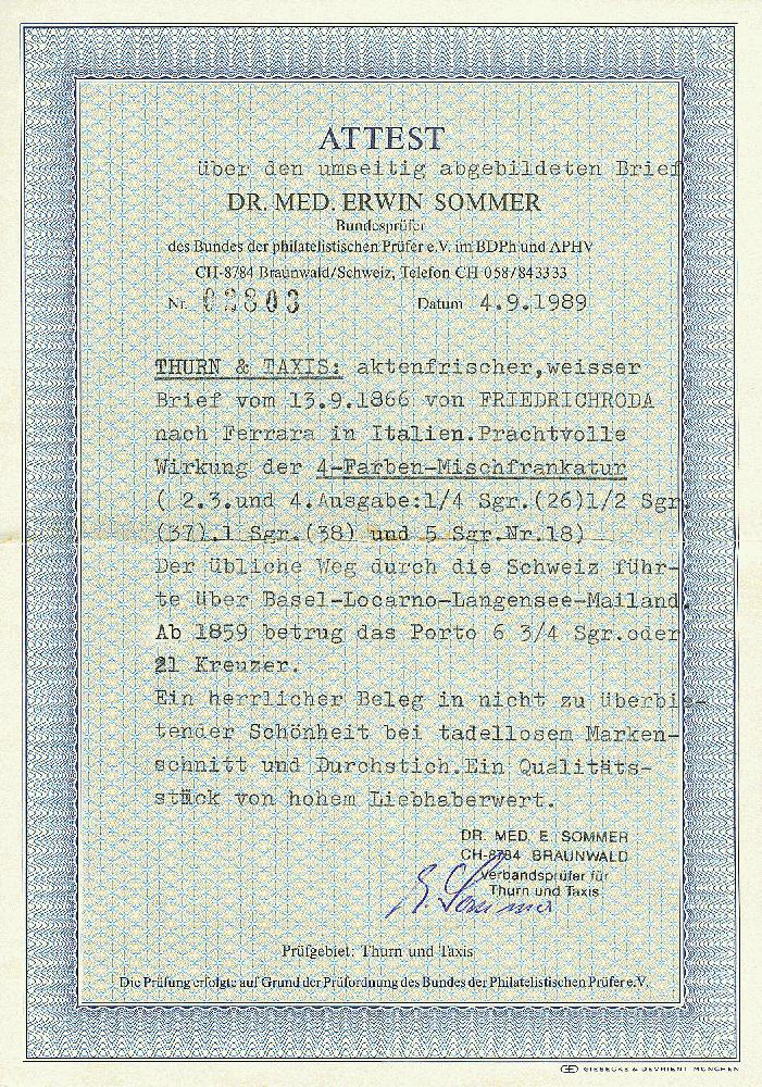 | Zusatzinformationen und Suchstichworte: | Dr. Derichs 170. Auktion 3. Juni 2023 Los 1385 Altdeutschland Thurn und Taxis \VIERFARBENFRANKATUR ÜBER DREI VERSCHIEDENE AUSGABEN NACH ITALIEN\: 5 Sgr. braunpurpur und 1/4 Sgr. schwarz, beide geschnitten und jeweils voll- bis breitrandig, in Mischfrankatur mit der farblos durchstochenen Ausgabe 1/2 Sgr. orange und 1 Sgr. karminrosa (diese oben winzige Randkorrektur, sonst alle Marken einwandfrei) auf Brief mit klaren Nummernstempeln "272" und Aufgabe-K2 "Friedrichroda 13.9.1866" nach Ferrara/Italien, nebengesetzt schwarzer "PD". Tarifrichtige 6 3/4-Silbergroschen-Frankatur für einen einfachen Brief durch die Schweiz nach Italien mit 3 Silbergroschen für den Postverein, 2 Silbergroschen Schweizer Transit und 1 3/4 Silbergroschen italienischem Weiterfranko. Fotoattest Dr. Sommer BPP und neues Fotoattest Sem BPP: "Eine beeindruckende und seltene Mischfrankatur von drei verschiedenen Ausgaben, mit klaren Stempeln entwertet." Zuschlag 1.600,00 EUR |