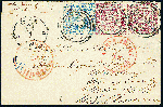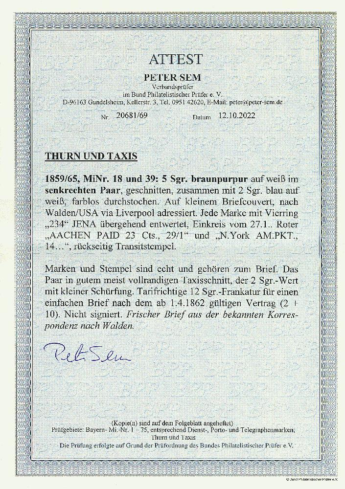 | Zusatzinformationen und Suchstichworte: | Dr. Derichs 170. Auktion 3. Juni 2023 Los 1386 Altdeutschland Thurn und Taxis 5 Sgr. braunpurpur, senkrechtes Paar in gutem meist vollrandigen Taxisschnitt in Mischfrankatur mit 2 Sgr. blau "farblos durchstochen" (kleine Schürfung) auf Brief mit Nummernstempeln "234" und Aufgabe-K1 "Jena 27/1" nach Walden/USA mit Leitvermerk "via Liverpool", vorderseitig mit roten Durchgangsstempeln von Aachen und New York. Tarifrichtige 12-Silbergroschen-Frankatur mit 2 Silbergroschen für den Postverein und 10 Silbergroschen Weiterfranko. Neues Fotoattest Sem BPP: "Frischer Brief aus der bekannten Korrespondenz nach Walden." Zuschlag 1.100,00 EUR |