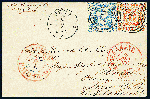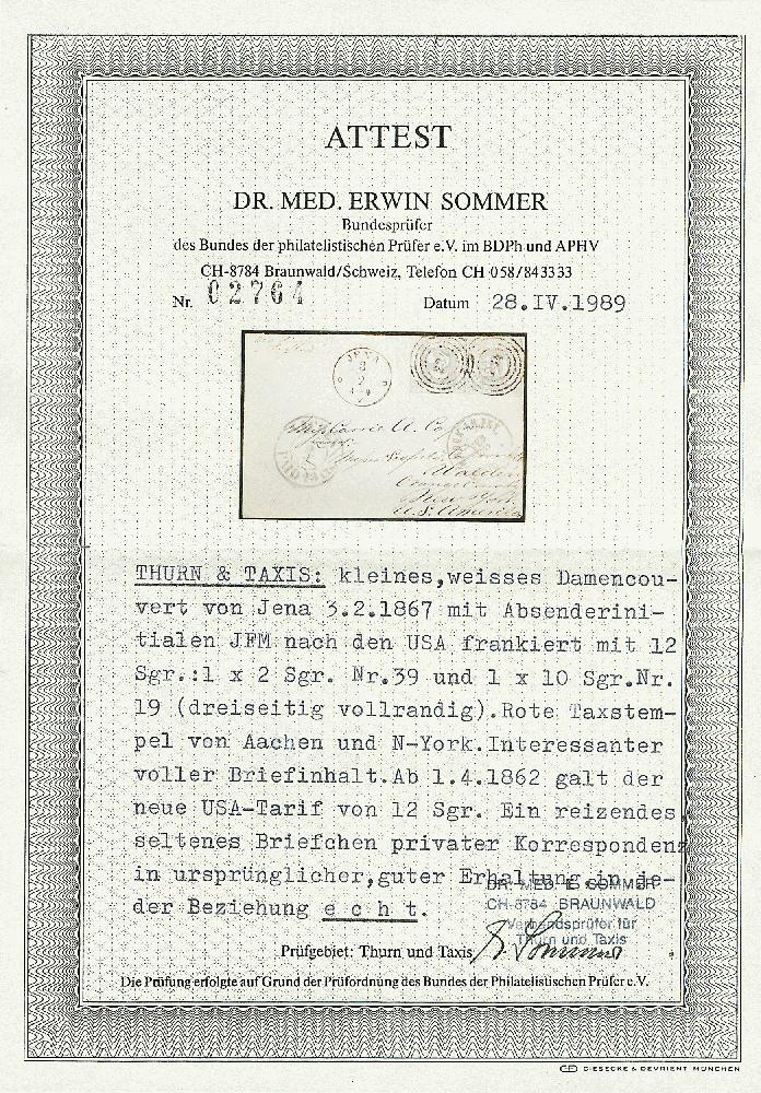 | Zusatzinformationen und Suchstichworte: | Dr. Derichs 170. Auktion 3. Juni 2023 Los 1387 Altdeutschland Thurn und Taxis 10 Sgr. orange, meist vollrandiger Taxisschnitt und an zwei Seiten nur gering tangiert, in Mischfrankatur mit 2 Sgr. blau "farblos durchstochen" (kleine Randkerbe) auf kleinem frischen Kuvert (Inhalt noch inliegend) mit Nummernstempeln "234" und Aufgabe-K1 "Jena 3/2" (1867) nach Walden/USA, vorderseitig mit roten Transitstempeln von Aachen und New York sowie rückseitig mit Transitstempel von Köln. Tarifrichtige 12-Silbergroschen-Frankatur für einen einfachen Brief laut dem ab 1.4.1862 gültigen Vertrag mit 2 Silbergroschen für den Postverein und 10 Silbergroschen Weiterfranko. Fotoattest Dr. Sommer BPP und neues Fotoattest Sem BPP: "Aktenfrisches Couvert aus der bekannten Korrespondenz nach Walden.". (Michel 3.000.-) Zuschlag 2.400,00 EUR |