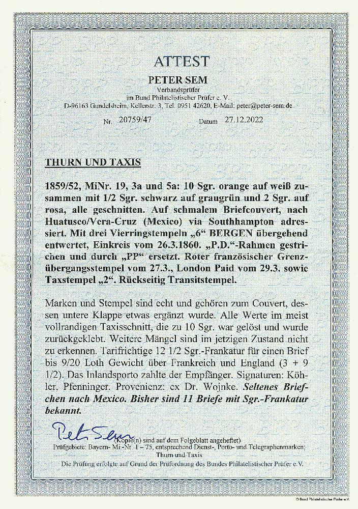 | Zusatzinformationen und Suchstichworte: | Dr. Derichs 170. Auktion 3. Juni 2023 Los 1388 Altdeutschland Thurn und Taxis \DESTINATION "MEXICO"\: 10 Sgr. orange "II. Ausgabe" in Mischfrankatur mit 1/2 Sgr. schw./graugrün und 2 Sgr. schw./rosa "I. Ausgabe" auf kleinem Kuvert mit Nummernstempeln "6" und Aufgabe-K1 "Bergen 26.3.1860" nach Huatusco/Vera Cruz/Mexico. Mit Leitvermerk "via Southampton", schwarzem "P.D.", dieser gestrichen und durch schwarzen "PP" ersetzt, rotem französischen Grenzübergangsstempel und rotem "London Paid", rückseitig u.a. mit Durchgangsstempel von Frankfurt und zwei französischen Transitstempeln. Untere Klappe des Kuverts etwas ergänzt, alle Marken im meist vollrandigen Taxisschnitt, die 10 Silbergroschen war gelöst und wurde exakt replaziert. Tarifrichtige 12 1/2-Silbergroschen-Frankatur für einen Brief bis 9/20 Loth Gewicht über Frankreich und England mit 3 Silbergroschen für den Postverein und 9 1/2 Silbergroschen Weiterfranko. Das mexikanische Inlandsporto zahlte der Empfänger. Ein sehr dekorativer Brief mit seltener Dreifarbenfrankatur incl. der höchsten Nominale des Sammelgebietes. Neues Fotoattest Sem BPP: "Seltenes Briefchen nach Mexico. Bisher sind 11 Briefe mit Sgr.-Frankatur bekannt." Zuschlag 2.800,00 EUR |