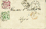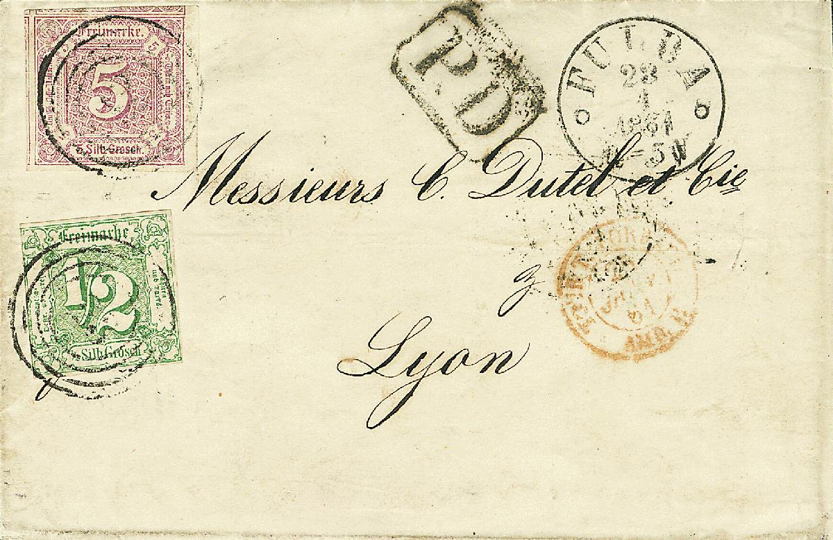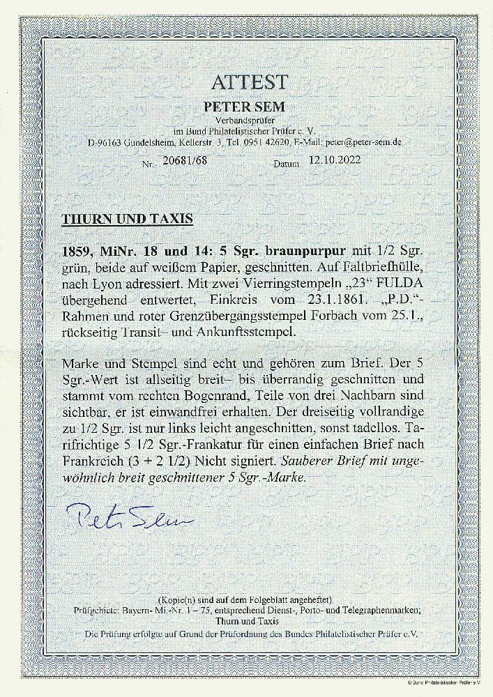 | Zusatzinformationen und Suchstichworte: | Dr. Derichs 170. Auktion 3. Juni 2023 Los 1390 Altdeutschland Thurn und Taxis 5 Sgr. braunpurpur, vom rechten Bogenrand stammend und riesenrandig mit Teilen von drei Nachbarmarken, zusammen mit 1/2 Sgr. grün, nur links leicht berührt und dreiseitig breitrandig, auf Brief mit Nummernstempeln "23" und Aufgabe-K1 "Fulda 23.1.1861" nach Lyon/Frankreich, nebengesetzt schwarzer "P.D." und roter Grenzübergangsstempel. Neues Fotoattest Sem BPP: "Sauberer Brief mit ungewöhnlich breit geschnittener 5 Sgr.-Marke." Zuschlag 380,00 EUR |