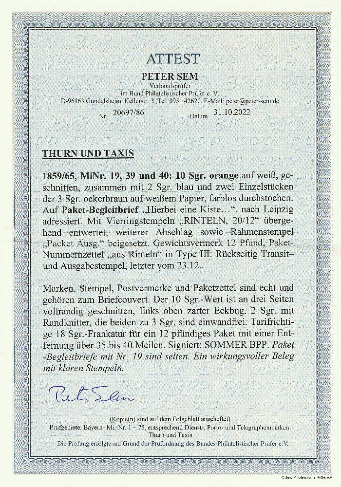 | Zusatzinformationen und Suchstichworte: | Dr. Derichs 170. Auktion 3. Juni 2023 Los 1391 Altdeutschland Thurn und Taxis 10 Sgr. orange, dreiseitig voll- bis überrandig (links oben zarter Eckbug), zusammen mit 2 Sgr. blau "farblos durchstochen" (Randknitter) und zwei tadellosen 3 Sgr. ockerbraun "farblos durchstochen" auf Paketbegleitbrief "Hierbei eine Kiste..." mit klaren K1 "Rinteln 20/12" auf den Marken und nochmals beigesetzt nach Leipzig/Königreich Sachsen. Mit schwarz/weißem Paketzettel "707. aus Rinteln (Taxquadrat: 281)". Tarifrichtige 18-Silbergroschen-Frankatur für ein 12 Pfund schweres Paket mit einer Entfernung über 35 bis 40 Meilen. Wenn man bedenkt, daß frankierte Paketbegleitbriefe von Thurn & Taxis per se sehr selten sind, dann wird die Bedeutung dieses Briefes mit der 10-Silbergroschen-Marke um so deutlicher. Neues Fotoattest Sem BPP: "Paket-Begleitbriefe mit Nr. 19 sind selten. Ein wirkungsvoller Beleg mit klaren Stempeln." Zuschlag 2.400,00 EUR |