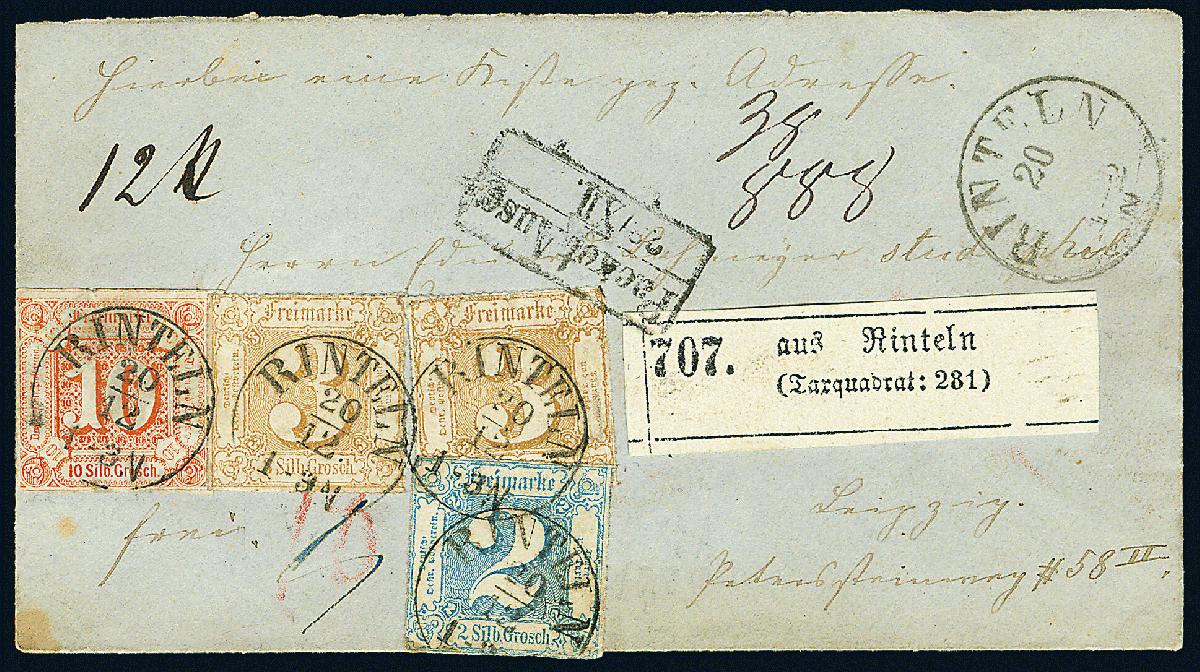 | Zusatzinformationen und Suchstichworte: | Dr. Derichs 170. Auktion 3. Juni 2023 Los 1391 Altdeutschland Thurn und Taxis 10 Sgr. orange, dreiseitig voll- bis überrandig (links oben zarter Eckbug), zusammen mit 2 Sgr. blau "farblos durchstochen" (Randknitter) und zwei tadellosen 3 Sgr. ockerbraun "farblos durchstochen" auf Paketbegleitbrief "Hierbei eine Kiste..." mit klaren K1 "Rinteln 20/12" auf den Marken und nochmals beigesetzt nach Leipzig/Königreich Sachsen. Mit schwarz/weißem Paketzettel "707. aus Rinteln (Taxquadrat: 281)". Tarifrichtige 18-Silbergroschen-Frankatur für ein 12 Pfund schweres Paket mit einer Entfernung über 35 bis 40 Meilen. Wenn man bedenkt, daß frankierte Paketbegleitbriefe von Thurn & Taxis per se sehr selten sind, dann wird die Bedeutung dieses Briefes mit der 10-Silbergroschen-Marke um so deutlicher. Neues Fotoattest Sem BPP: "Paket-Begleitbriefe mit Nr. 19 sind selten. Ein wirkungsvoller Beleg mit klaren Stempeln." Zuschlag 2.400,00 EUR |
