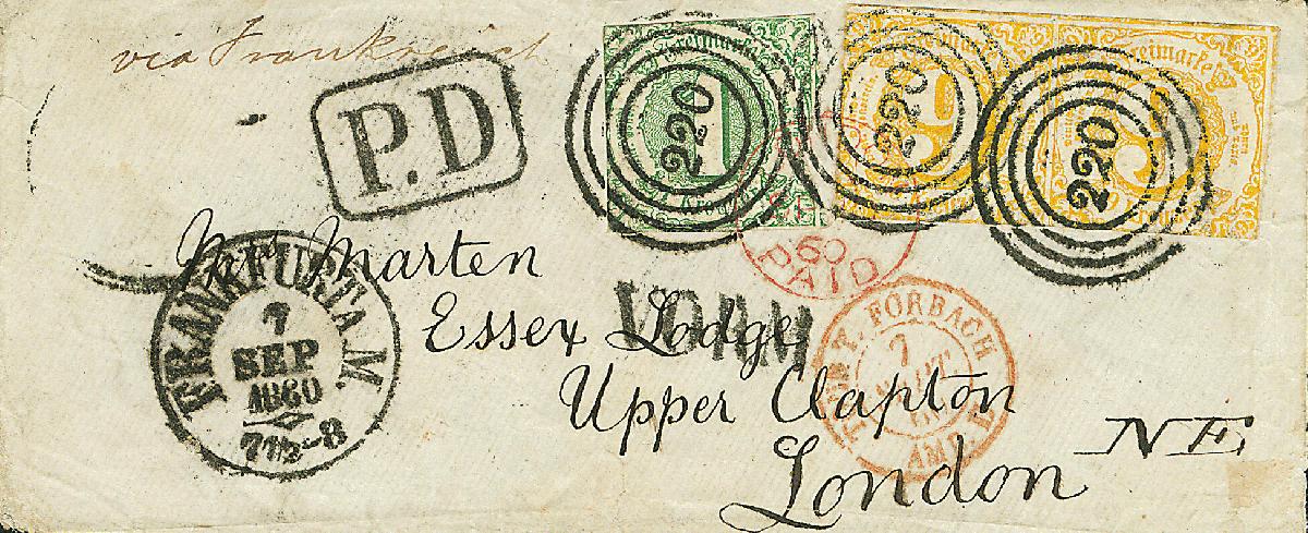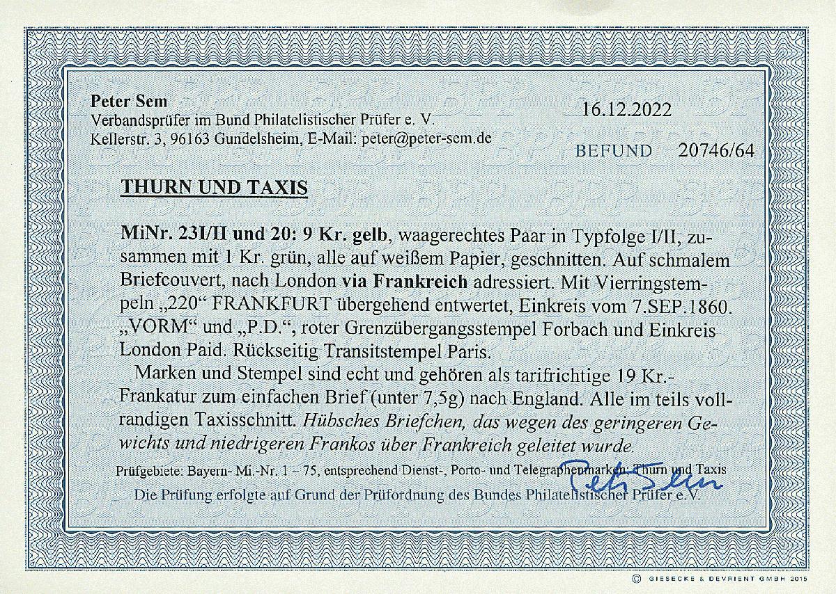 | Zusatzinformationen und Suchstichworte: | Dr. Derichs 170. Auktion 3. Juni 2023 Los 1401 Altdeutschland Thurn und Taxis 9 Kr. gelb, waagerechtes Typen-Paar (linke Marke Type "I", rechte Type "II") zusammen mit 1 Kr. grün, alle Marken in teils voll- bis überrandigem Taxisschnitt, auf kleinem Kuvert mit Nummernstempeln "220" und Aufgabe-K1 "Frankfurt a.M. 7 Sep.1860" nach London/Großbritannien mit vorderseitigem Leitvermerk "via Frankreich". Mit vier nebengesetzten bzw. teils auf die Frankatur übergehenden Stempeln: "Vorm.", "P.D." in Schwarz, rotem französischen Grenzübergangsstempel und rotem "London Paid". Tarifrichtige 19-Kreuzer-Frankatur für einen einfachen Brief unter 7,5 Gramm Gewicht via Frankreich nach England. Neuer Fotobefund Sem BPP: "Hübsches Briefchen, das wegen des geringeren Gewichts und niedrigeren Frankos über Frankreich geleitet wurde." Zuschlag 1.100,00 EUR |